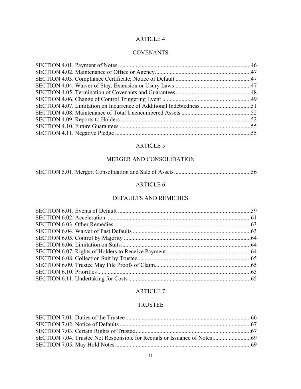 二、第四条《盟约》第4.01款。票据的支付.....................................................................................46第4.02条。办公室或机构的维护...................................................................47第4.03节。合规证书;违约通知...................................................47第4.04条。放弃逗留、延期或高利贷法....................................................47第4.05条。终止契诺及保证...................................................48第4.06条。控制权变更触发事件....................................................................49第4.07节。对发生额外债务的限制..................................51第4.08条。未设押资产总额的维持情况...................................................52第4.09节。向持有人的报告.......................................................................................52第4.10条。未来的担保......................................................................................55第4.11节。负质押....................................................................................................55第五条合并、合并第5.01款。合并、合并、出售资产....................................................56第六条违约及补救办法第6.01款。违约事件...................................................................................................59第6.02条。加速..................................................................................................61第6.03节。其他补救办法.....................................................................................................63第6.04条。过去违约的豁免................................................................................................63第6.05条。多数控制......................................................................................64第6.06条。诉讼时效....................................................................................64第6.07条。持有人收取货款的权利.....................................................................64第6.08条。受托人的催收诉讼.....................................................................................65第6.09条。受托人可提出债权证明...................................................................................65第6.10条。优先事项...................................................................................................65第6.11节。承担费用...................................................................................................65第七条受托人第7.01款。受托人的职责.....................................................................................................66第7.02条。违约通知...................................................................................................67第7.03条。受托人的某些权利................................................................................................67第7.04条。受托人不负责陈述或发行票据...................................69第7.05条。可能持有票据.......................................................................................................69