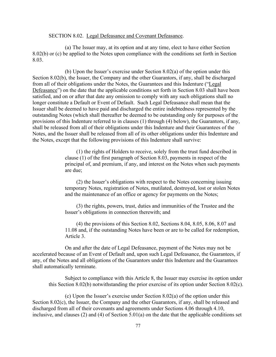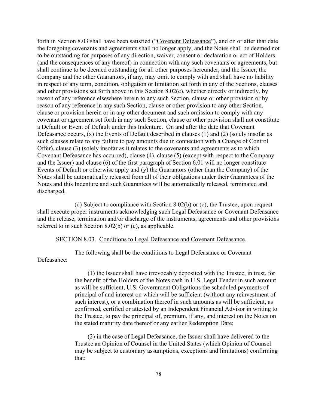 77第8.02条。法律上的失责和契约上的失责。(a)发行人在符合第8.03条所列条件后,可随时选择将第8.02(b)或(c)条中的任何一条适用于《票据》。(b)发行人根据第8.02(b)条下的选择权第8.02(a)条行使后,发行人、公司及其他担保人(如有的话)须于第8.03条所列的适用条件已获满足之日解除其在票据、担保及本契约下的所有义务(“法律失效”),而在该日期或之后,任何未遵守任何该等义务的行为均不再构成违约或违约事件。此种法定撤销是指发行人应被视为已支付并解除未偿还票据所代表的全部债务(此后仅就下文第(1)至(4)条所述的本义齿的规定而言,应被视为未偿还),担保人(如有)应解除其在本义齿下的所有义务及其对票据的担保,发行人应解除其在本义齿和票据下的所有其他义务,但本契约的下列规定仍然有效的除外:(1)持有人在票据到期时仅从第8.03条第1款第(1)款所述信托基金收取与票据本金、溢价(如有)及利息有关的付款的权利;(2)发行人与票据有关的义务,涉及发行临时票据、票据登记、票据残缺、毁损、遗失或被盗以及为票据的付款维持办事处或代理机构;(3)权利、权力、信托,受托人的职责及豁免,以及发行人与此有关的义务;及(4)本条第8.02条、第8.04、8.05、8.06、8.07及11.08条的规定,如未偿还票据已被或将被要求赎回,则第3条。在法定撤销之日及之后,不得因违约事件而加速支付票据,且在该法定撤销后,票据的担保(如有)以及担保人在本契约和担保项下的所有义务应自动终止。在遵守本条第8款的前提下,发行人可以根据本条第8.02(b)款行使其选择权,尽管已根据第8.02(c)款事先行使其选择权。(c)在发行人根据第8.02(c)条下的选择权第8.02(a)条行使时,发行人、公司及其他担保人(如有的话)须在适用条件设定的日期获解除并解除其根据第4.06至4.10条(包括在内)及第5.01(a)条第(2)及(4)条所订立的所有契诺及协议