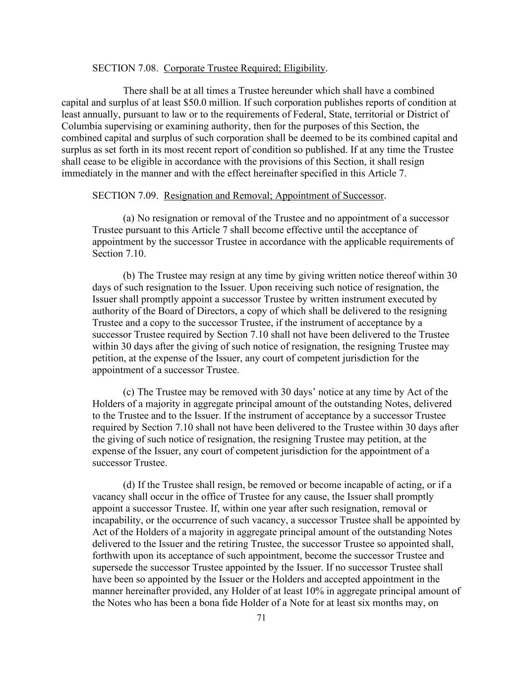 71第7.08条。所需的公司受托人;资格。在任何时候,本协议项下的受托人应拥有至少5000万美元的合并资本和盈余。如果该公司至少每年根据法律或根据联邦、州、地区或哥伦比亚特区监督或审查当局的要求发布条件报告,则就本节而言,该公司的合并资本和盈余应被视为其如此发布的最近一次条件报告中所述的合并资本和盈余。如受托人在任何时候根据本条规定不再符合资格,则应立即按本条第7条下文规定的方式和效力辞职。第7.09节。辞职、免职;任命继任者。(a)在继任受托人根据第7.10条的适用要求接受任命之前,受托人的任何辞职或免职以及根据第7条对继任受托人的任何任命均不得生效。(b)受托人可随时向发行人发出书面辞职通知,在该辞职后30天内提出辞职。发行人收到该辞职通知后,应迅速以董事会授权签立的书面文书指定继任受托人,该书面文书的副本应交付给辞职受托人,一份副本应交付给继任受托人,如第7.10条要求的继任受托人接受文书在该辞职通知发出后30天内尚未交付给受托人,则辞职受托人可请求任何有管辖权的法院指定继任受托人,费用由发行人承担。(c)受托人可随时提前30天通知将未偿票据本金总额多数的持有人的行为解除,并将其交付给受托人和发行人。如第7.10条所规定的继任受托人的接纳文书在发出该辞职通知后30天内仍未交付予受托人,则该辞职受托人可向任何有管辖权的法院申请委任继任受托人,费用由发行人承担。(d)如受托人须辞职、被免职或变得无行为能力,或因任何原因出现受托人职位空缺,发行人须迅速委任继任受托人。如在该等辞职、撤职或无行为能力或出现该等空缺后一年内,应根据交付给发行人和退任受托人的未偿票据本金总额多数持有人的行为指定继任受托人,则如此指定的继任受托人应在其接受该项任命后立即成为继任受托人,并取代发行人指定的继任受托人。如任何继任受托人不得已获发行人或持有人如此委任,并按以下规定的方式接受委任,任何已成为票据善意持有人至少六个月的票据本金总额至少10%的持有人,可于