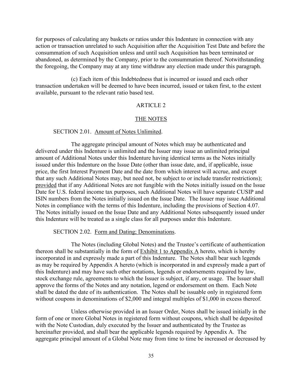 35用于计算在收购测试日期之后和该收购完成之前与该收购无关的任何行动或交易在本契约下的任何篮子或比率,除非并直到该收购在完成之前由公司确定已终止或放弃。尽管有上述规定,公司可随时撤回根据本段作出的任何选择。(c)根据相关的基于比率的测试,在可获得的范围内,发生或发行的此项债务的每一项以及相互进行的交易将被视为已发生、发行或优先承担。第二条注第2.01款。票据金额不限。根据本契约可认证和交付的票据本金总额是无限的,发行人可根据本契约发行本金总额无限的附加票据,其条款与在发行日(发行日,以及(如适用)发行价格、第一个付息日和自产生利息之日起)根据本契约首次发行的票据相同,但任何该等附加票据可以但不必,受制于或包括转让限制);前提是,如果任何附加票据出于美国联邦所得税目的与发行日最初发行的票据不可互换,则此类附加票据将与发行日最初发行的票据具有单独的CUSIP和ISIN号。发行人可以根据本义齿的条款,包括第4.07节的规定,发行附加票据。最初于发行日发行的票据以及随后根据本契约发行的任何附加票据将被视为本契约下所有目的的单一类别。第2.02节。形式和日期;面额。票据(包括Global Notes)及其上的受托人认证证书应基本上采用附录A的附件 1的形式,该附录A在此被纳入本义齿并明确成为其一部分。票据应附有本协议附录A(已纳入本契约并明确成为其一部分)可能要求的图例,并可能附有法律、证券交易所规则、发行人须遵守的协议(如有)或惯例要求的其他注释、图例或背书。发行人应批准票据的形式及其上的任何符号、图例或背书。每份说明应注明其认证日期。票据只能以记名形式发行,不附带面额为2000美元和超过1000美元的整数倍的息票。除发行人令另有规定外,票据最初应以一张或多张记名形式的全球票据无息票形式发行,该票据应存放于票据托管人,由发行人正式签署,并按下文规定由受托人认证,并应载有附录A要求的适用图例。全球票据的本金总额可不时由