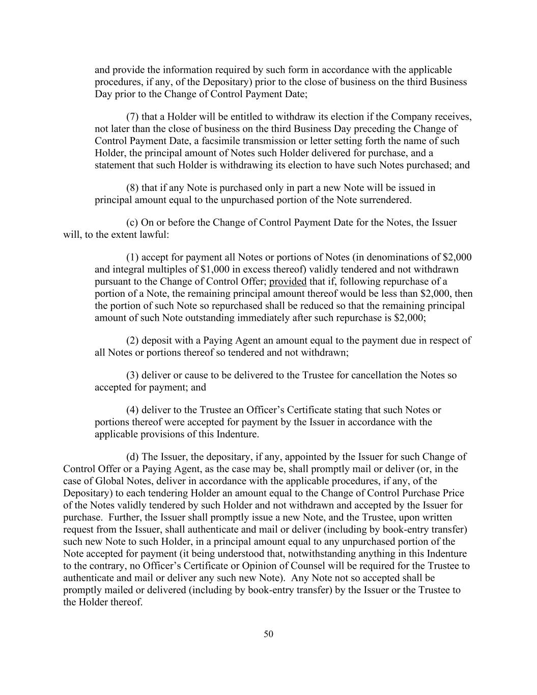 50并根据存托人的适用程序(如有)提供该表格所要求的信息)在控制权变更支付日之前的第三个营业日营业时间结束前;(7)如公司不迟于控制权变更支付日之前的第三个营业日营业时间结束前收到载明该持有人名称、该持有人交付购买的票据本金金额的传真传送或信函,则持有人将有权撤回其选择,及声明该持有人正撤回其购买该等票据的选择;及(8)如任何票据仅部分购买,将发行本金相等于已交还票据的未购买部分的新票据。(c)在票据控制权变更支付日或之前,发行人将在合法范围内:(1)接受根据控制权变更要约有效投标且未被撤回的所有票据或票据部分(面值为2,000美元且超过1,000美元的整数倍)进行支付;但前提是,如果在回购票据的一部分后,其剩余本金金额将低于2,000美元,则如此购回的该等票据的部分须予减少,以使紧接该等购回后该等未偿还票据的剩余本金为2,000美元;(2)向付款代理存入相当于就如此投标且未撤回的所有票据或其部分到期付款的金额;(3)交付或安排交付予受托人以注销如此接受付款的票据;及(4)向受托人交付一份高级人员证明书,述明该等票据或其部分已获发行人根据本契约的适用条文接受付款。(d)发行人、发行人就该控制权变更要约指定的存托人(如有)或付款代理人(视情况而定)应迅速向每个投标持有人邮寄或交付(或,就全球票据而言,按照存托人的适用程序(如有)交付)相当于该持有人有效投标且未被发行人撤回并接受购买的票据的控制权变更购买价格的金额。此外,发行人应迅速发行新的票据,而受托人应发行人的书面请求,认证并邮寄或交付(包括通过记账式转让)该新票据给该持有人,本金金额等于接受付款的票据的任何未购买部分(据了解,尽管本义齿中有任何相反的规定,受托人认证并邮寄或交付任何该新票据将不需要任何高级职员证书或律师意见)。任何未被如此接受的票据,应由发行人或受托人及时邮寄或交付(包括以记账式转让方式)给其持有人。