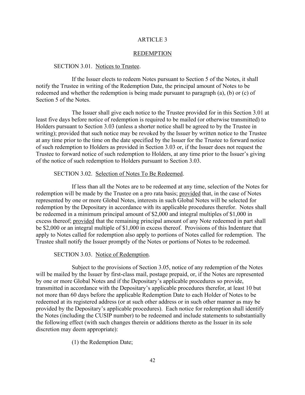 42第三条赎回第3.01款。向受托人发出的通知。发行人如依据票据第5条选择赎回票据,须以书面通知受托人赎回日期、将予赎回的票据本金金额,以及是否根据票据第5条(a)、(b)或(c)段进行赎回。发行人须在依据第3.03条规定须将赎回通知邮寄(或以其他方式传送)予持有人的至少五天前,向本条第3.01条规定的受托人发出每份通知(除非受托人须以书面同意较短的通知);但该通知可由发行人在发行人指明的日期之前的任何时间以书面通知方式向受托人撤销,以便受托人按第3.03条的规定将该赎回通知转交持有人,或,如果发行人没有要求受托人将此类赎回通知转发给持有人,则在发行人根据第3.03条向持有人发出此类赎回通知之前的任何时间。第3.02节。选择要赎回的票据。如果在任何时候要赎回的票据少于全部,则受托人将按比例选择要赎回的票据;但如果是由一个或多个全球票据所代表的票据,则此种全球票据的权益将由存托人根据其适用程序选择赎回。票据应以最低本金2000美元和超过1000美元的整数倍赎回;但部分赎回的任何票据的剩余本金应为2000美元或超过1000美元的整数倍。本契约适用于被要求赎回的票据的条款也适用于被要求赎回的票据的部分。受托机构应将拟赎回的票据或部分票据及时通知发行人。第3.03节。赎回通知。在符合第3.05节规定的情况下,任何赎回票据的通知将由发行人以头等邮件邮寄,邮资预付,或者,如果票据由一张或多张全球票据代表,并且如果保存人的适用程序有此规定,则按照保存人的适用程序传送,至少在适用赎回日期前10天但不超过60天在其注册地址(或在保存人的适用程序可能提供的其他地址或以其他方式)向每个将被赎回的票据持有人发送。每份赎回通知均应指明将予赎回的票据(包括CUSIP号码),并应包括效果大致如下的报表(附有发行人全权酌情认为适当的变更或增补):(1)赎回日期;