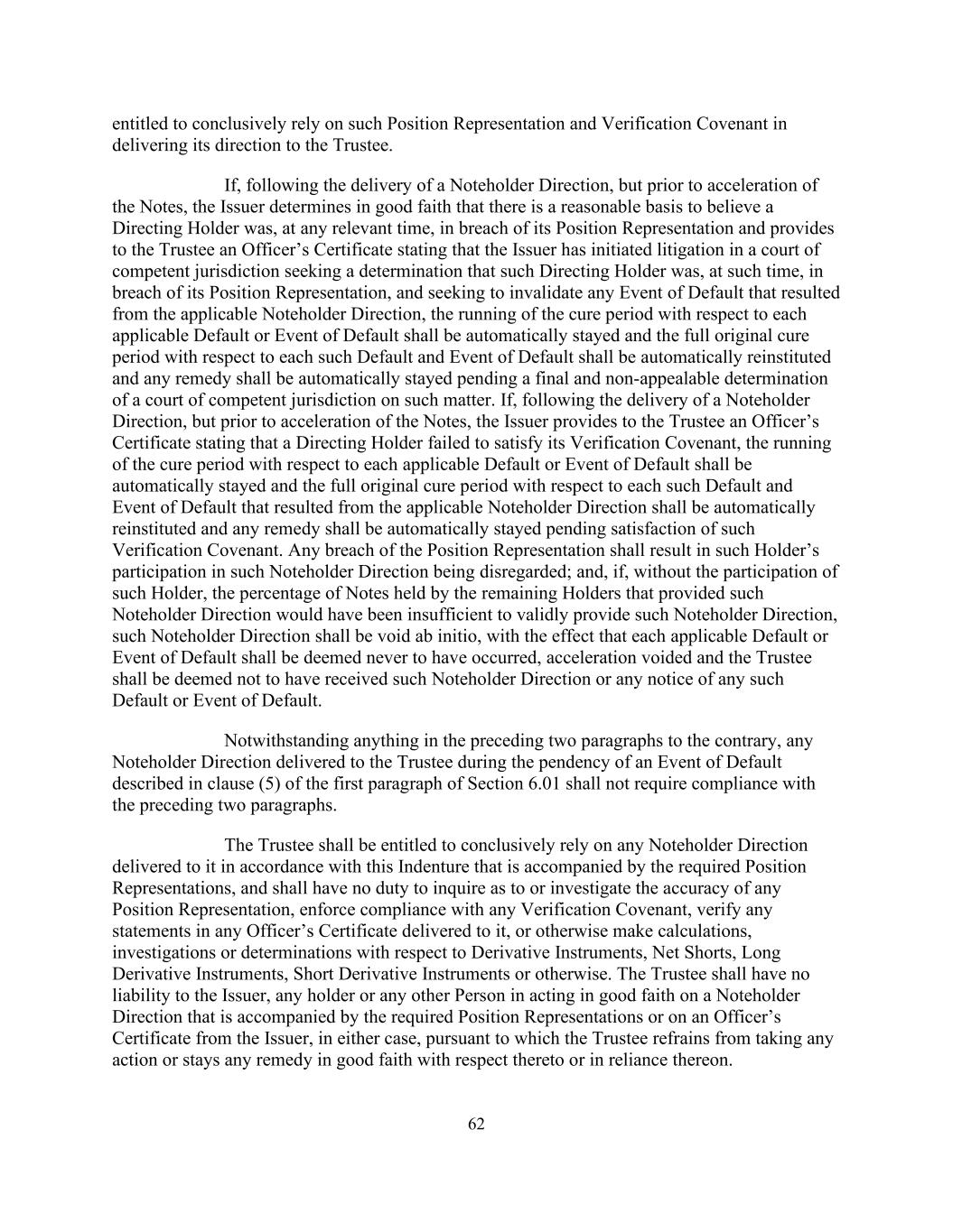 62有权在向受托人交付指示时最终依赖此类立场陈述和核查公约。如果在交付票据持有人指示之后,但在票据加速发行之前,发行人善意地确定有合理依据认为指示持有人在任何相关时间违反了其头寸代表,并向受托人提供了一份高级人员证明,说明发行人已在有管辖权的法院提起诉讼,寻求确定该指示持有人当时违反了其头寸代表,并寻求使适用的票据持有人指示导致的任何违约事件无效,应自动中止与每一项适用的违约或违约事件有关的补救期的运行,并自动重新启动与每一项此类违约和违约事件有关的完整的原始补救期,并自动中止任何补救措施,以待有管辖权的法院就该事项作出最终且不可上诉的裁定。如果在票据持有人指示交付后,但在票据加速执行之前,发行人向受托人提供了一份说明指示持有人未能满足其核查盟约的高级职员证书,则应自动中止与每项适用的违约或违约事件有关的补救期的运行,并自动重新启动与每项此类违约和因适用的票据持有人指示而导致的违约事件有关的完整原始补救期,任何补救措施应自动中止,以待满足该核查盟约。任何违反头寸表示的行为应导致该持有人参与该票据持有人指示的情况被置之不理;如果没有该持有人的参与,提供该票据持有人指示的其余持有人所持有的票据百分比将不足以有效提供该票据持有人指示,则该票据持有人指示应从一开始就无效,大意是每一项适用的违约或违约事件应被视为从未发生,加速无效,受托人应被视为未收到此类票据持有人指示或任何此类违约或违约事件的通知。尽管前两款有任何相反的规定,但在第6.01条第一款第(5)款所述违约事件未决期间交付给受托人的任何票据持有人指示不应要求遵守前两款。受托人有权最终依赖根据本契约交付给其的任何票据持有人指示,并附有所需的头寸陈述,并且没有义务查询或调查任何头寸陈述的准确性,强制遵守任何验证契约,核实交付给它的任何高级职员证书中的任何陈述,或以其他方式就衍生工具、净空头、多头衍生工具、空头衍生工具或其他方面进行计算、调查或确定。受托人对发行人、任何持有人或任何其他人在附有所需职位陈述的记账人指示上或在发行人的高级职员证书上善意行事不负任何法律责任,在任何一种情况下,据此,受托人不对其采取任何行动,或在善意或依赖该指示的情况下保持任何补救措施。