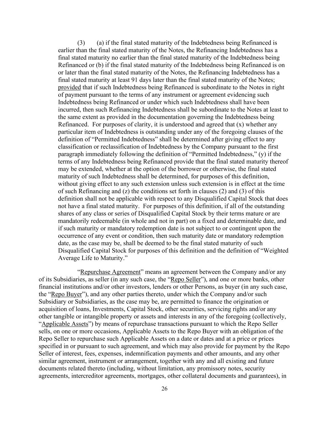 26(3)(a)如果被再融资债务的最终声明到期日早于票据的最终声明到期日,则再融资债务的最终声明到期日不早于被再融资债务的最终声明到期日,或(b)如果被再融资债务的最终声明到期日在票据的最终声明到期日或之后,再融资债务的最终声明到期日至少晚于票据的最终声明到期日91天;但如果根据任何证明此类债务正在被再融资或应已发生此类债务的文书或协议的条款,正在被再融资的此类债务在受付权上从属于票据,则该再融资债务应至少在管辖被再融资债务的文件中规定的相同程度上从属于票据。为清楚起见,经理解及同意,(x)任何特定项目的债务是否在“许可债务”定义的前述任何条款下未清偿,须在公司根据紧接“许可债务”定义之后的第一款对债务进行任何分类或重新分类生效后确定,(y)如任何正在进行再融资的债务的条款规定可延长其最后陈述的期限,不论是由借款人选择还是以其他方式延长,则就本定义而言,应确定该债务的最后陈述的期限,而不使任何该等延长生效,除非该等延长在该等再融资时已生效,及(z)本定义第(2)及(3)条所载的条件不适用于没有最后陈述的期限的任何不合格股本。就本定义而言,如果任何类别或系列的不合格股本的所有已发行股份按其条款到期或可在固定和可确定的日期强制赎回(全部而非部分),并且如果该到期日或强制赎回日不受任何事件或条件的发生或取决于该事件或条件的发生,则该到期日或强制赎回日(视情况而定),就本定义和“到期加权平均年限”的定义而言,应被视为此类不合格股本的最终规定到期日。「回购协议」指公司及/或作为卖方的任何附属公司(在任何该等情况下为「回购卖方」)与作为买方的一间或多于一间银行、其他金融机构及/或其他投资者、贷款人或其他人士(在任何该等情况下为「回购买方」)及其任何其他订约方之间的协议,根据该协议,公司及/或该等附属公司或附属公司(视情况而定)获准为发起或收购贷款、投资、股本、其他证券,通过回购交易的方式为上述任何一项中的权利和/或任何其他有形或无形财产或资产和权益(统称“适用资产”)提供服务权和/或任何其他有形或无形财产或资产和权益,据此,回购卖方在一个或多个场合向回购买方出售适用资产,回购卖方有义务在一个或多个日期以该协议或根据该协议规定的一个或多个价格回购该等适用资产,该回购交易还可能规定回购卖方支付利息、费用、开支、赔偿款项和其他金额,以及任何其他类似协议,文书或安排,连同与之有关的任何及所有现有及未来文件(包括但不限于任何本票、担保协议、债权人间协议、抵押、其他抵押文件及担保),于