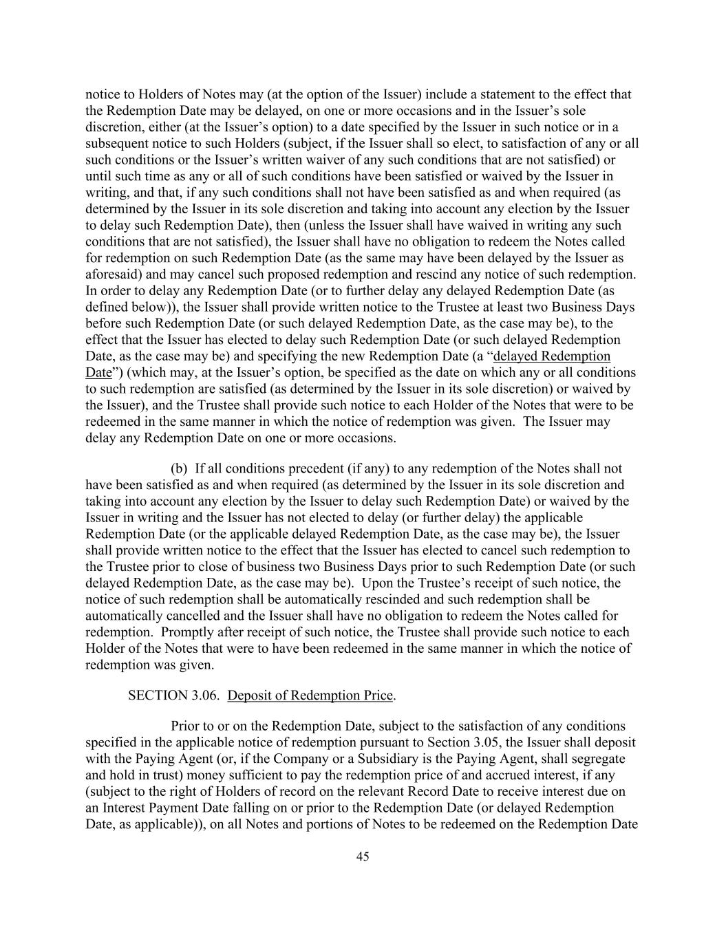 45向票据持有人发出的通知可(由发行人选择)包括一项声明,大意是赎回日期可在一个或多个场合并由发行人全权酌情决定(由发行人选择)延迟至发行人在该通知或随后向该等持有人发出的通知中指明的日期(但如发行人如此选择,至满足任何或所有该等条件或发行人书面放弃任何未获满足的该等条件),或直至任何或所有该等条件已获满足或由发行人以书面放弃,且如任何该等条件在需要时(由发行人全权酌情决定并考虑到发行人作出任何延迟该赎回日期的选择而确定)未获满足,则(除非发行人已书面放弃任何未获满足的该等条件),发行人没有义务在该赎回日期赎回被要求赎回的票据(因为发行人可能已如前述延迟),并可取消该建议赎回并撤销任何有关该赎回的通知。为延迟任何赎回日期(或进一步延迟任何延迟赎回日期(定义见下文)),发行人须在该赎回日期(或该延迟赎回日期,视情况而定)至少两个营业日前向受托人提供书面通知,大意为发行人已选择延迟该赎回日期(或该延迟赎回日期,视情况而定)并指明新的赎回日期(“延迟赎回日期”)(发行人可选择,指明为满足该等赎回的任何或所有条件(由发行人全权酌情决定)或由发行人放弃的日期,而受托人须以发出赎回通知的相同方式向将予赎回的每名票据持有人提供该等通知。发行人可以在一个或多个场合延迟任何赎回日期。(b)如任何赎回票据的所有先决条件(如有的话)在规定时(由发行人全权酌情决定并考虑到发行人选择延迟该赎回日期而确定)或由发行人以书面放弃,而发行人并无选择延迟(或进一步延迟)适用的赎回日期(或适用的延迟赎回日期,视情况而定),发行人应提供书面通知,大意为发行人已选择在该赎回日期(或视情况而定的延迟赎回日期)前两个营业日结束前向受托人取消该赎回。在受托人收到该通知后,该赎回通知应自动撤销,该赎回应自动取消,发行人没有义务赎回被要求赎回的票据。受托人在接获该通知后,须迅速将该通知提供予每名本应以发出赎回通知的相同方式获赎回的票据持有人。第3.06节。赎回价款的交存。在赎回日之前或当日,在根据第3.05条满足适用的赎回通知中指明的任何条件的情况下,发行人应向付款代理人(或,如公司或附属公司为付款代理人,则应分离并以信托方式持有)存入足以支付赎回价款和应计利息的款项,如有(受限于相关记录日期的记录持有人有权收取在赎回日或之前的利息支付日(或延迟赎回日)到期的利息,(如适用)),于赎回日期将予赎回的所有票据及部分票据上