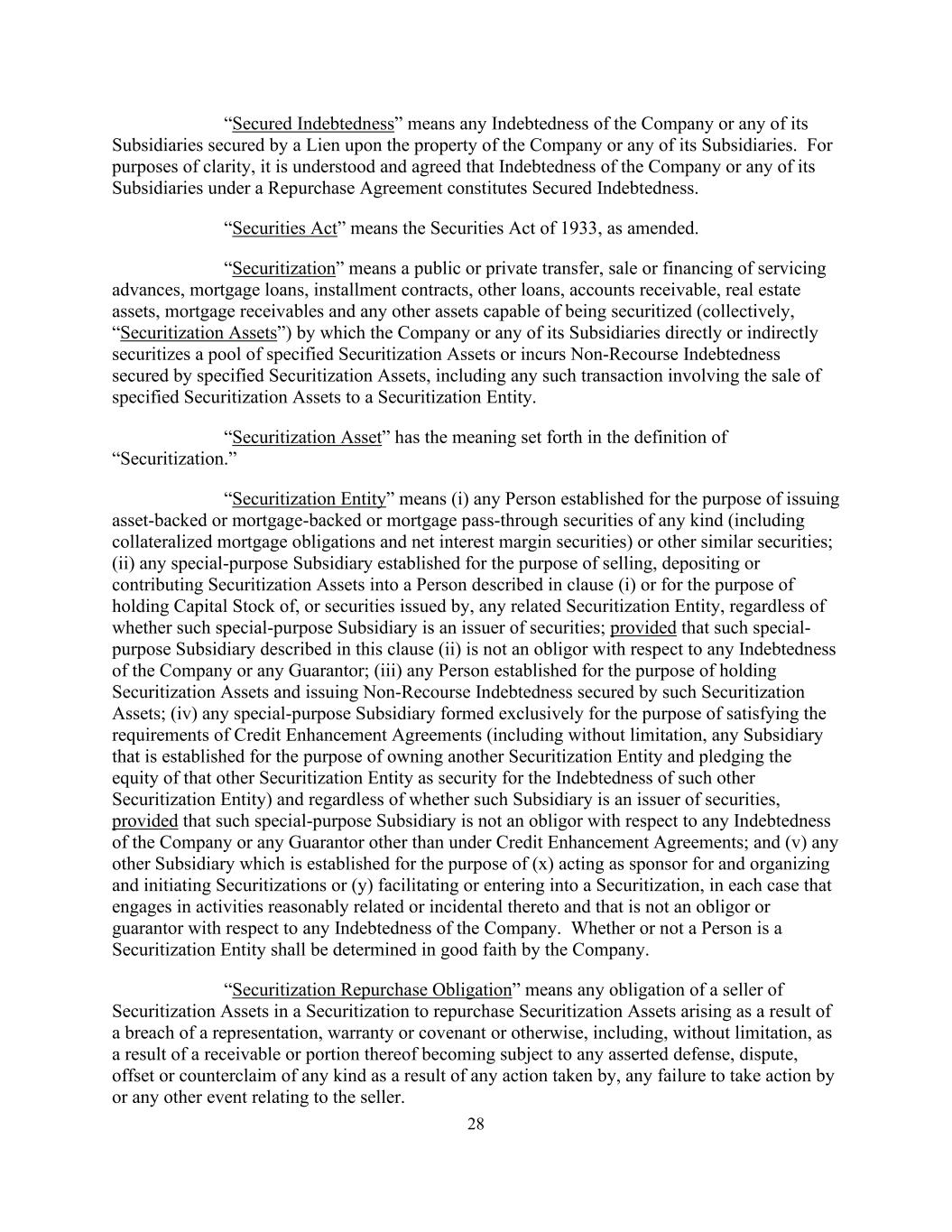 28“有担保债务”是指公司或其任何子公司以公司或其任何子公司的财产上的留置权作为担保的任何债务。为清楚起见,理解及同意公司或其任何附属公司在回购协议项下的债务构成有担保债务。“证券法”是指经修订的1933年《证券法》。“证券化”是指公司或其任何子公司将特定证券化资产池直接或间接证券化或产生由特定证券化资产担保的无追索权债务的公开或私下转让、出售或融资的服务垫款、抵押贷款、分期合同、其他贷款、应收账款、不动产资产、应收抵押贷款和任何其他能够证券化的资产(统称“证券化资产”),包括涉及向证券化实体出售特定证券化资产的任何此类交易。“证券化资产”具有“证券化”定义中阐述的含义。“证券化实体”是指(i)为发行任何种类的资产支持或抵押支持或抵押转手证券(包括抵押抵押债务和净息差证券)或其他类似证券而成立的任何人;(ii)为向第(i)款所述的人出售、存放或贡献证券化资产而成立的任何特殊目的子公司,或为持有任何相关证券化实体的股本或由其发行的证券而成立的任何特殊目的子公司,不论该等特殊目的附属公司是否为证券发行人;条件是本条款(ii)所述的该等特殊目的附属公司并非公司或任何担保人的任何债务的债务人;(iii)为持有证券化资产及发行由该等证券化资产担保的无追索权债务而成立的任何人士;(iv)专为满足信用增进协议的要求而成立的任何特殊目的附属公司(包括但不限于,为拥有另一证券化实体并将该另一证券化实体的股权作为该其他证券化实体债务的担保而设立的任何子公司),且无论该子公司是否为证券发行人,前提是该特殊目的子公司不是公司或任何担保人的任何债务的义务人,但信用增进协议项下除外;以及(v)为(x)担任发起人并组织和发起证券化或(y)促进或进入证券化而设立的任何其他子公司,在每一情况下,从事与之合理相关或附带的活动,且不是公司任何债务的义务人或担保人。个人是否为证券化主体,由公司善意认定。“证券化回购义务”是指证券化中证券化资产的出卖人因违反陈述、保证或契诺或其他原因而产生的回购证券化资产的任何义务,包括但不限于因应收款或其部分因出卖人采取的任何行动、未采取行动或与出卖人有关的任何其他事件而成为任何声称的抗辩、争议、抵消或任何种类的反索赔的结果。