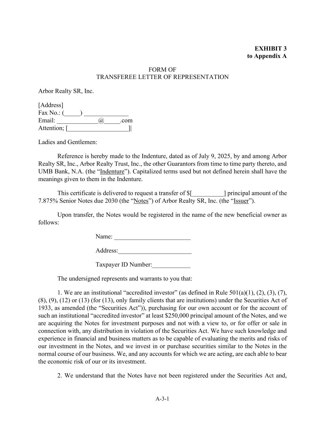 A-3-1附件3附录一表受让人代表函件Arbor Realty SR,Inc. [地址]传真号码:(______)_____________邮箱:______________ @______.com注意;[ ______________________ ] |女士们先生们:兹提述Arbor Realty SR,Inc.、Arbor Realty Trust, Inc.、不时作为其担保方的其他担保人以及UMB Bank,N.A.(此处使用但未定义的大写术语应具有义齿中赋予它们的含义。本证书的交付是为了请求将Arbor Realty SR,Inc.(“发行人”)于2030年到期的7.875%优先票据(“票据”)的本金金额$ [ __________ ]进行转让。转让时,票据将登记在新的实益拥有人名下如下:姓名:__________________________地址:______________________纳税人身份证号码:______________以下签署人向您声明并保证:1。根据经修订的1933年《证券法》(“证券法”),我们是机构“认可投资者”(定义见规则501(a)(1)、(2)、(3)、(7)、(8)、(9)、(12)或(13)(对于(13),仅针对作为机构的家庭客户),为我们自己的账户或为此类机构“认可投资者”的账户购买至少250,000美元本金的票据,我们购买票据是为了投资目的,而不是为了任何违反《证券法》的分配,或为了要约或出售。我们在财务和商业事务方面拥有知识和经验,能够评估我们投资于票据的优点和风险,我们在正常业务过程中投资或购买与票据类似的证券。我们,以及我们正在行动的任何账户,都能够各自承担我们或其投资的经济风险。2.我们了解到,票据并未根据《证券法》进行注册,,