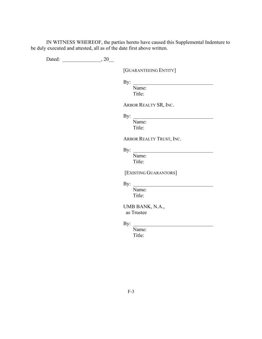 F-3作为证人,本合同各方已促使本补充契约得到正式签署和证明,所有这些都是在上述第一个书面日期。日期:______________,20__ [担保实体]由:______________________________ Name:title:ARBOR REALTY SR,INC。作者:_____________________________名:标题:ARBOR REALTY TRUST,INC。受托方:__________________________名称:标题:[现有担保人]受托方:__________________________________名称:UMB银行,N.A.,作为受托人:______________________________名称:标题:
