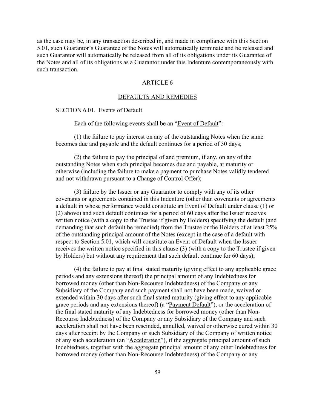 59视情况而定,在符合本条第5.01款所述的任何交易中,该担保人对票据的担保将自动终止并解除,该担保人将自动解除其在其对票据的担保下的所有义务以及与该交易同时作为担保人在本契约下的所有义务。第六条违约和补救办法第6.01款。违约事件。下列每一事件均为“违约事件”:(1)未能支付任何未偿还票据到期应付的利息,且违约持续30天;(2)未能支付任何未偿还票据的本金和溢价(如有),当该本金到期应付时,在到期或其他情况下(包括未能支付款项以购买根据控制权变更要约有效提交且未撤回的票据);(3)发行人或任何担保人未能遵守本契约所载的其任何其他契诺或协议(契诺或协议除外,其履行将构成上文第(1)或(2)条规定的违约事件),且该违约在发行人收到书面通知后的60天内持续(并抄送受托人如由持有人作出)指明由受托人或票据未偿还本金至少25%的持有人作出的违约(并要求补救该等违约)(除非就第5.01条而言的违约情况,当发行人收到本条第(3)款规定的书面通知(如由持有人提供,则须向受托人提供一份副本)但并无任何要求此种违约持续60天的要求时,将构成违约事件;(4)未能在最终规定的到期日(使任何适用的宽限期及其任何延期生效)支付公司或公司任何附属公司的任何借款债务(无追索权债务除外)的本金,且该等付款不得已作出,在该等最终声明到期(使任何适用的宽限期及其任何延期生效)(“付款违约”)后30天内豁免或延长,或公司或公司任何附属公司的借款债务(无追索权债务除外)的任何债务的最终声明到期加速,且该加速不得在公司或公司该附属公司收到任何该等加速的书面通知(“加速”)后30天内被撤销、废止、豁免或以其他方式纠正,如果该等债务的本金总额,连同任何其他债务的本金总额就公司所借款项(无追索权债务除外)或任何