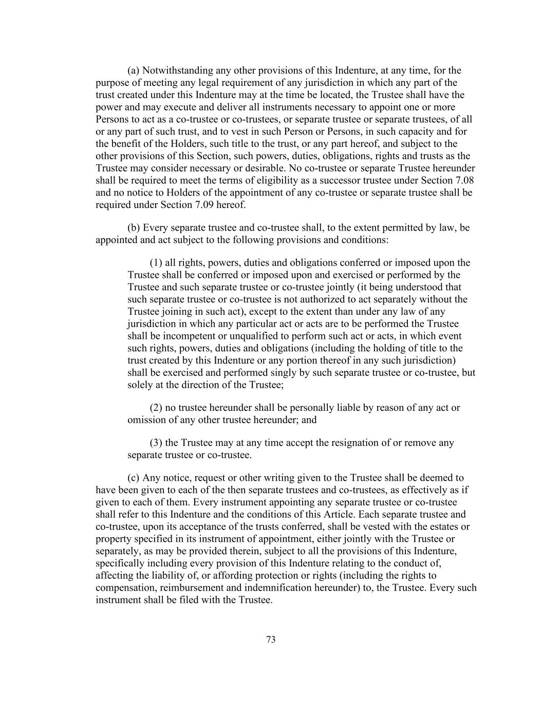 73(a)尽管有本契约的任何其他条文,但在任何时候,为满足根据本契约设立的信托的任何部分当时可能所在的任何司法管辖区的任何法律规定,受托人有权并可签立和交付一切必要文书,以委任一名或多于一名人士担任该信托的全部或任何部分的共同受托人或共同受托人,或独立受托人或独立受托人,并以该等身份并为持有人的利益归属该等人士,信托的所有权或本协议的任何部分,并在符合本条其他规定的情况下,受托人认为必要或可取的权力、职责、义务、权利和信托。本条例所订的共同受托人或独立受托人无须符合第7.08条所订的继任受托人资格条款,亦无须根据本条例第7.09条就任何共同受托人或独立受托人的委任向持有人发出通知。(b)每名独立受托人及共同受托人须在法律许可的范围内获委任及行事,但须符合以下条文及条件:(1)所有授予或强加予受托人的权利、权力、职责及义务,均须授予或强加予受托人及该独立受托人或共同受托人,并由该受托人及该独立受托人或共同受托人共同行使或履行(但有一项谅解,即该独立受托人或共同受托人未获授权在该受托人加入该等作为的情况下分别行事),除非根据任何司法管辖区的任何法律而须履行任何特定作为或作为,否则受托人将无资格或无资格履行该等作为或作为,在此情况下,该等权利、权力、义务和义务(包括在任何该等司法管辖区内持有由本契约或其任何部分所设立的信托的所有权)须由该独立受托人或共同受托人单独行使和履行,但仅应受托人的指示;(2)本协议项下的受托人不得因本协议项下任何其他受托人的任何作为或不作为而承担个人责任;及(3)受托人可随时接受任何单独受托人或共同受托人的辞呈或解除其职务。(c)给予受托人的任何通知、要求或其他书面,须当作已给予当时各自独立的受托人及共同受托人,其效力犹如给予他们各自一样。每份委任任何独立受托人或共同受托人的文书,均须参考本契约及本条的条件。每名独立的受托人及共同受托人在接受所授出的信托后,均须获授予其委任文书所指明的遗产或财产,可与受托人共同或按其中可能规定的分别归属,但须遵守本契约的所有条文,具体包括本契约有关受托人的行为、影响其法律责任或向其提供保护或权利(包括根据本契约获得补偿、补偿和赔偿的权利)的每项条文。每份该等文书均须向受托人备案。