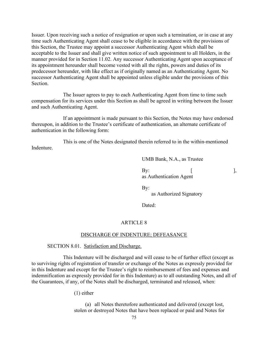75发行人。在收到该辞职通知或在该终止时,或在任何时候该认证代理人根据本条规定不再符合资格的情况下,受托人可委任一名发行人可接受的继任认证代理人,并须按第11.02条规定的方式向所有持有人发出该委任的书面通知。任何继任认证代理人在接受其在本协议项下的委任时,即被赋予其前任在本协议项下的所有权利、权力和义务,其效力如同最初被指定为认证代理人一样。除非符合本条规定的资格,否则不得指定继任认证代理人。发行人同意不时向各认证代理人支付发行人与该认证代理人书面约定的对其在本节项下服务的补偿。如果根据本节作出指定,除了受托人的认证证书外,票据可能已在其上签署了以下形式的替代认证证书:这是在所提及的义齿中提及的其中指定的票据之一。UMB Bank,N.A.作为受托人:[ ],作为认证代理人:作为授权签字人日期:第8条解除契约;DefeASANCE第8.01条。满意与出院。本契约将被解除且不再具有进一步效力(本契约明文规定的票据转让或交换登记的存续权利除外,以及本契约明文规定的受托人偿还费用和开支以及赔偿的权利除外),所有未偿还的票据,且票据的所有担保(如有)应解除、终止和解除,当:(1)任一(a)之前认证和交付的所有票据(遗失除外,已被替换或支付的被盗或销毁的票据和票据