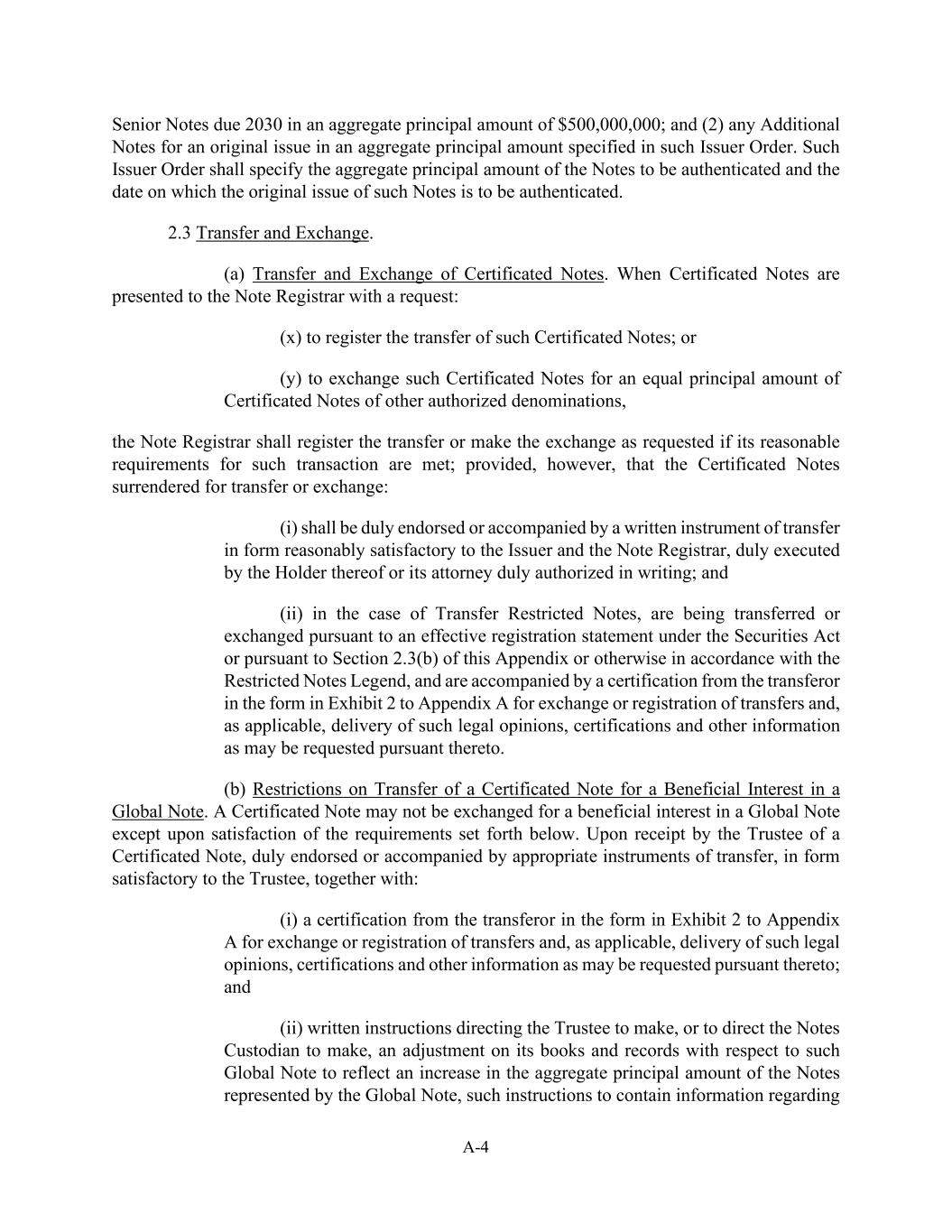 2030年到期本金总额为500,000,000美元的A-4优先票据;及(2)该发行人命令中指明的本金总额为原始发行的任何额外票据。该发行人命令应指明待认证票据的本金总额以及该等票据的原始发行的认证日期。2.3转让和交换。(a)有凭证票据的转让和交换。当凭证式票据向票据注册处处长提出以下要求时:(x)登记该等凭证式票据的转让;或(y)将该等凭证式票据兑换为等额本金的其他认可面值的凭证式票据,票据注册处处长须在其对该等交易的合理要求得到满足的情况下,按要求登记转让或进行交换;但条件是,为转让或交换而交回的凭证式票据:(i)须妥为背书或附有书面转让文书,其格式须令发行人及票据注册处处长合理满意,(ii)就转让受限制票据而言,正根据《证券法》或根据本附录第2.3(b)节或根据受限制票据图例以其他方式根据有效的登记声明进行转让或交换,并附有转让人以附录A的附件 2中表格的证明,以进行转让的交换或登记,并在适用情况下交付据此可能要求的法律意见、证明和其他信息。(b)对转让全球票据受益权益的有证票据的限制。经认证的票据不得交换为全球票据的实益权益,除非满足以下规定。受托人在收到经适当背书或附有适当转让文书的、形式为受托人满意的凭证式票据后,连同:(i)转让人为交换或登记转让而以附录A的附件 2格式提供的证明,并(如适用)交付据此可能要求的法律意见、证明和其他资料;及(ii)指示受托人作出或指示票据托管人作出的书面指示,就该全球票据对其账簿和记录进行调整,以反映全球票据所代表的票据本金总额的增加,此类指示包含有关