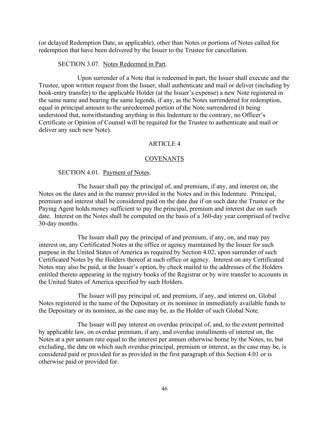 46(或延迟赎回日,视情况而定),但发行人已交付受托人注销的被要求赎回的票据或部分票据除外。第3.07节。部分赎回的票据。在交出部分赎回的票据后,发行人须签立,而受托人应发行人的书面要求,认证并邮寄或交付(包括以记账式转帐方式)予适用的持有人(费用由发行人承担)一张与为赎回而交出的票据以相同名称登记并附有相同图例(如有的话)的新票据,其本金额相当于所交出的票据的未赎回部分(据了解,尽管本契约中有任何相反的规定,受托人认证及邮寄或交付任何该等新票据,无须任何高级人员证明书或大律师意见)。第四条盟约第4.01款。票据的支付。发行人应按票据和本契约规定的日期和方式支付票据的本金、溢价(如有)和利息。如果受托人或付款代理人在该日期持有足以支付在该日期到期的本金、溢价和利息的款项,则本金、溢价和利息应视为在该日期到期支付。票据的利息应根据由十二个30天的月份组成的360天年度计算。发行人须于发行人在美利坚合众国为第4.02条规定的目的而维持的办事处或代理机构在该办事处或代理机构交出任何凭证式票据时,就该等凭证式票据支付本金及溢价(如有的话),并可就该等凭证式票据支付利息。任何凭证式票据的利息也可由发行人选择以支票邮寄至注册处处长登记簿中所载有权获得该票据的持有人的地址或以电汇方式支付至该等持有人指定的美利坚合众国账户。发行人将以即时可用资金向作为该全球票据持有人的存托人或其代名人(视情况而定)支付以存托人或其代名人名义登记的全球票据的本金、溢价(如有)及利息。发行人将支付票据逾期本金的利息,并在适用法律许可的范围内,支付票据逾期溢价(如有)的利息,以及票据逾期分期的利息,年利率等于票据以其他方式承担的年利率,直至但不包括该等逾期本金、溢价或利息(视情况而定)被视为按本条第4.01款规定已支付或已提供或已以其他方式支付或已提供的日期。