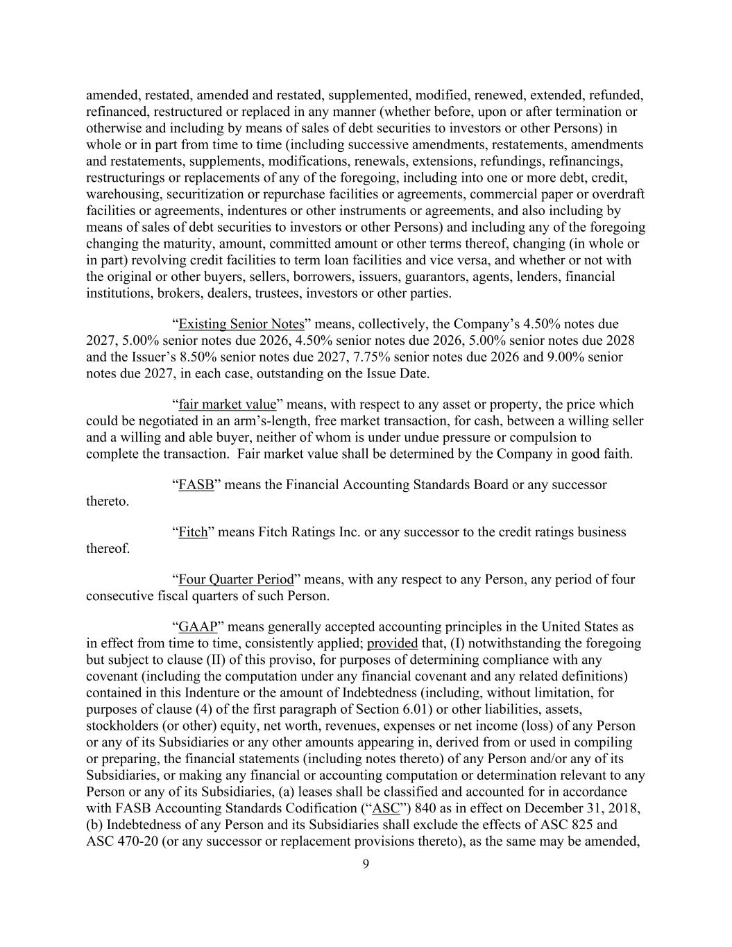 9不时以任何方式(不论是在终止前、终止时或之后或以其他方式,包括通过向投资者或其他人出售债务证券的方式)全部或部分(包括连续的修订、重述、修订和重述、补充、修改、续期、延期、退款、再融资、重组或替换上述任何一项,包括变成一项或多项债务、信贷、仓储、证券化或回购便利或协议、商业票据或透支便利或协议、契约或其他文书或协议,还包括通过向投资者或其他人出售债务证券的方式)和包括上述任何一项变更期限、金额、承诺金额或其他条款、将(全部或部分)循环信贷融资变更为定期贷款融资、反之亦然,以及无论是否与原始或其他买方、卖方、借款人、发行人、担保人、代理人、贷款人、金融机构、经纪人、交易商、受托人、投资者或其他方。“现有优先票据”是指公司2027年到期的4.50%票据、2026年到期的5.00%优先票据、2026年到期的4.50%优先票据、2028年到期的5.00%优先票据以及发行人2027年到期的8.50%优先票据、2026年到期的7.75%优先票据和2027年到期的9.00%优先票据,在每种情况下,在发行日均未偿还。“公平市场价值”是指,就任何资产或财产而言,可以在公平、自由的市场交易中以现金方式,在有意愿的卖方和有意愿和有能力的买方之间进行谈判的价格,双方都没有受到不应有的压力或强迫来完成交易。公允市场价值由公司善意确定。“FASB”是指财务会计准则委员会或其任何继任者。“惠誉”是指惠誉国际评级公司或其信用评级业务的任何继承者。“四季期”就任何人而言,是指该人连续四个财政季度的任何期间。“公认会计原则”是指在美国不时生效、一贯适用的公认会计原则;但前提是,(i)尽管有上述规定,但受本但书第(II)条约束,为确定遵守本契约所载的任何契诺(包括根据任何财务契诺和任何相关定义的计算)或债务金额(包括但不限于为第6.01条第一款第(4)款的目的)或其他负债、资产、股东(或其他)权益、净值、收入,任何人或其任何附属公司的开支或净收入(亏损),或任何人和/或其任何附属公司的财务报表(包括报表附注)中出现、衍生或用于编制、或作出与任何人或其任何附属公司有关的任何财务或会计计算或确定时所使用的任何其他金额,(a)租赁应根据2018年12月31日生效的FASB会计准则编纂(“ASC”)840进行分类和会计处理,(b)任何人及其附属公司的债务均须排除ASC 825及ASC 470-20(或其任何继承或替代条文)的影响,(该等条文可予修订),