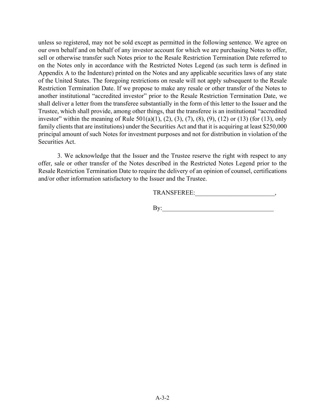 A-3-2除非如此注册,除非下句允许,否则不得出售。我们仅代表我们自己和代表我们购买票据的任何投资者账户,同意在票据上提及的转售限制终止日期之前根据票据上印制的限制性票据图例(该术语在义齿附录A中定义)和美国任何州的任何适用证券法提供、出售或以其他方式转让此类票据。上述回售限制在回售限制终止日之后不再适用。如我方提议在回售限制终止日之前将票据转售或以其他方式转让给其他机构“认可投资者”,我方应以本函的形式向发行人和受托人交付受让方的函件,函件应规定(其中包括)受让方为第501(a)(1)、(2)、(3)、(7)、(8)、(9)、(12)或(13)条所指的机构“认可投资者”(对于(13),仅限作为机构的家族客户)根据《证券法》,并表示其正在为投资目的而非违反《证券法》的分配而获得至少250,000美元本金的此类票据。3.我们确认,发行人和受托人保留权利,在转售限制终止日期之前,就限制性票据图例中所述的票据的任何要约、出售或其他转让要求提供律师意见、证明和/或发行人和受托人满意的其他信息。受让人:__________________________,由:__________________________________