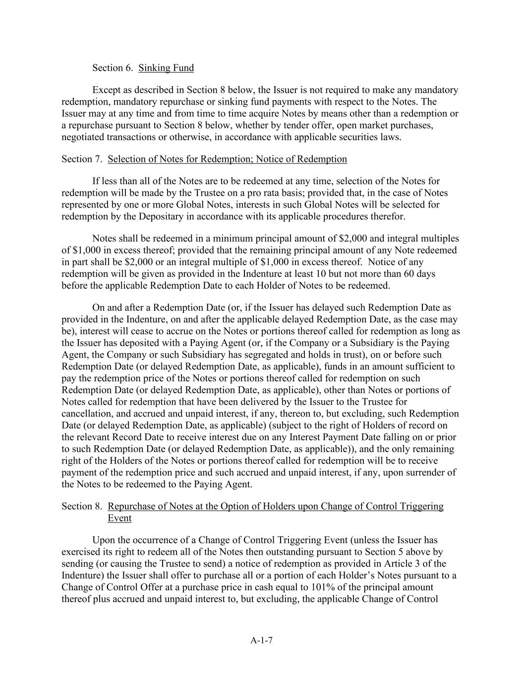 A-1-7第6节。偿债基金除下文第8节所述外,发行人无须就票据作出任何强制赎回、强制回购或偿债基金付款。发行人可以根据适用的证券法,随时并不时根据下文第8条以赎回或回购以外的方式获得票据,无论是通过要约收购、公开市场购买、协商交易或其他方式。第7节。选择赎回票据;赎回通知如果在任何时候要赎回的票据少于全部,则受托人将按比例选择赎回票据;但如果是由一个或多个全球票据所代表的票据,则此种全球票据的权益将由存托人根据其适用程序选择赎回。票据应以最低本金2000美元和超过1000美元的整数倍赎回;但部分赎回的任何票据的剩余本金应为2000美元或超过1000美元的整数倍。任何赎回通知将在适用的赎回日期前至少10天但不超过60天按契约规定向每名待赎回票据持有人发出。在赎回日期(或,如发行人已延迟义齿所规定的赎回日期,则在适用的延迟赎回日期(视属何情况而定)当日及之后),只要发行人已向付款代理人(或,如公司或附属公司为付款代理人,则公司或该附属公司已分离并以信托形式持有)存放,在该赎回日期(或适用的延迟赎回日期)当日或之前,要求赎回的票据或其部分将停止产生利息,金额足以支付在该赎回日(或适用的延迟赎回日)被要求赎回的票据或其部分的赎回价格的资金,但已由发行人交付受托人注销的票据或被要求赎回的票据部分以及截至(但不包括)该赎回日(或延迟赎回日)的应计未付利息(如有)除外,(如适用)(受限于有关记录日期的记录持有人有权收取在该赎回日期(或适用的延迟赎回日期)或之前的任何利息支付日期到期的利息),而票据或其部分的持有人唯一剩余的被要求赎回的权利将是在向付款代理交出将予赎回的票据时收取赎回价款及该等应计未付利息(如有)。第8节。在控制权变更触发事件发生时由持有人选择回购票据在控制权变更触发事件发生时(除非发行人已通过发送(或促使受托人发送)赎回通知的方式行使其根据上述第5条赎回当时未偿还的所有票据的权利义齿第3条规定)发行人应根据控制权变更要约提出购买每个持有人的全部或部分票据的要约,购买价格为现金,相当于其本金的101%加上适用的控制权变更的应计未付利息,但不包括