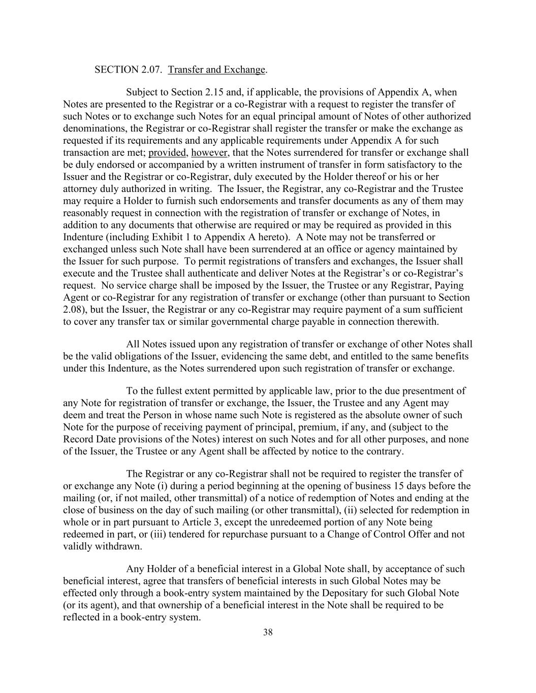 38第2.07节。转让和交换。除第2.15条及(如适用)附录A的条文另有规定外,当向处长或联席处长呈交票据,要求登记该等票据的转让或将该等票据兑换为等额本金的其他认可面值的票据时,处长或联席处长须按要求登记该等转让或作出交换,前提是该等交易的要求和附录A下的任何适用要求均获满足;但前提是,为转让或交换而交回的票据,须妥为背书或附有一份书面转让文书,其格式须令发行人及注册处处长或联席注册处处长满意,并由票据持有人或其获妥为书面授权的律师妥为签立。发行人、注册处处长、任何联席注册处处长及受托人可要求持有人提供其就转让或交换票据的登记而合理要求的背书及转让文件,以及本契约另有规定或可能规定的任何文件(包括本契约附录A的附件 1)。不得转让或交换票据,除非该票据已在发行人为此目的维持的办事处或机构交回。为准许转让和交换的登记,发行人应在书记官长或共同书记官长的要求下执行,受托人应认证和交付票据。发行人、受托人或任何注册官、付款代理人或共同注册官不得就任何转让或交换的登记(依据第2.08条除外)征收服务费,但发行人、注册官或任何共同注册官可要求支付一笔足以支付与此有关的任何转让税或类似政府收费的款项。在任何其他票据的转让或交换登记时发行的所有票据,应是发行人的有效义务,证明相同的债务,并有权在本契约下享有与在此类转让或交换登记时交出的票据相同的利益。在适用法律许可的最大范围内,在适当呈交任何票据以进行转让或交换登记之前,发行人、受托人和任何代理人可将以其名义登记该票据的人视为并将其视为该票据的绝对拥有人,以收取该票据的本金、溢价(如有)和(受票据的记录日期规定的限制)利息以及为所有其他目的,发行人、受托人或任何代理人均不受相反通知的影响。注册处处长或任何共同注册处处长无须在任何票据(i)在任何票据的赎回通知的邮寄(或如未邮寄,则以其他递送方式)开始并在该等邮寄(或其他递送)当日的营业结束时结束的期间内登记任何票据(i)的转让或交换,(ii)根据第3条选择全部或部分赎回,但任何票据的未赎回部分被部分赎回的情况除外,或(iii)根据控制权变更要约提出回购且未有效撤回。全球票据实益权益的任何持有人应通过接受此类实益权益,同意此类全球票据实益权益的转让只能通过保存人为此类全球票据(或其代理人)维护的记账系统进行,并且应要求票据实益权益的所有权应反映在记账系统中。