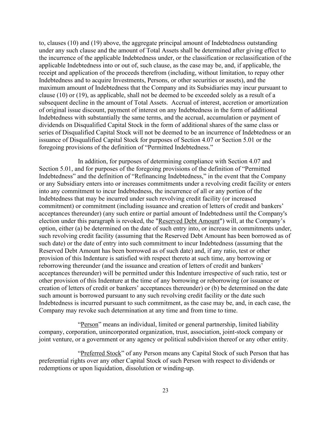 23至,上文第(10)及(19)条,任何该等条款下的未偿债务本金总额及总资产金额,须在根据该等条款(视情况而定)产生适用债务或将适用债务分类或重新分类为或从该等条款(视情况而定)及(如适用)收取及适用所得款项(包括但不限于偿还其他债务及取得投资、人员或其他证券或资产)后确定,以及公司及其附属公司根据第(10)或(19)条(如适用)可能产生的最高负债金额,不应被视为仅因随后总资产金额下降而超过。应计利息、原始发行折扣的增加或摊销、以条款基本相同的额外债务形式支付任何债务的利息,以及以同一类别或系列不合格股本的额外股份的形式就不合格股本的应计、累积或支付股息,将不被视为产生债务或发行不合格股本,就第4.07节或第5.01节或“允许的债务”定义的前述规定而言。此外,为确定是否符合第4.07节和第5.01节的规定,并为“许可债务”定义和“再融资债务”定义的前述规定,如公司或任何附属公司订立或增加循环信贷融资项下的承诺或订立任何产生债务的承诺,则产生该循环信贷融资项下可能产生的全部或任何部分债务(或增加的承诺)或承诺(包括签发和创设信用证及银行根据其承兑)(任何该等全部或部分债务金额直至公司根据本段作出的选择被撤销,“保留债务金额”)将由公司选择,(a)在订立该等循环信贷安排之日或增加该循环信贷安排项下的承诺(假设截至该日期已借入预留债务金额)或订立该承诺承担债务之日(假设截至该日期已借入预留债务金额)确定,如果在该时间满足本契约的任何比率、测试或其他规定,本契约下的任何借款或再借款(以及根据本契约签发和创设信用证和银行承兑汇票)将被允许,而不论在任何借款或再借款(或根据本契约签发或创设信用证或银行承兑汇票)时本契约的该等比率、测试或其他规定,或(b)在根据任何该等循环信贷融资借入该等金额之日或根据该等承诺(视情况而定)产生该等债务之日确定,并且在每种情况下,本公司可随时及不时撤销该等决定。“人”是指个人、有限或普通合伙企业、有限责任公司、公司、非法人组织、信托、协会、股份公司或合资企业,或政府或其任何机构或政治分支机构或任何其他实体。任何人的“优先股”是指该人的任何股本,在股息或赎回或清算、解散或清盘时,相对于该人的任何其他股本拥有优先权利。