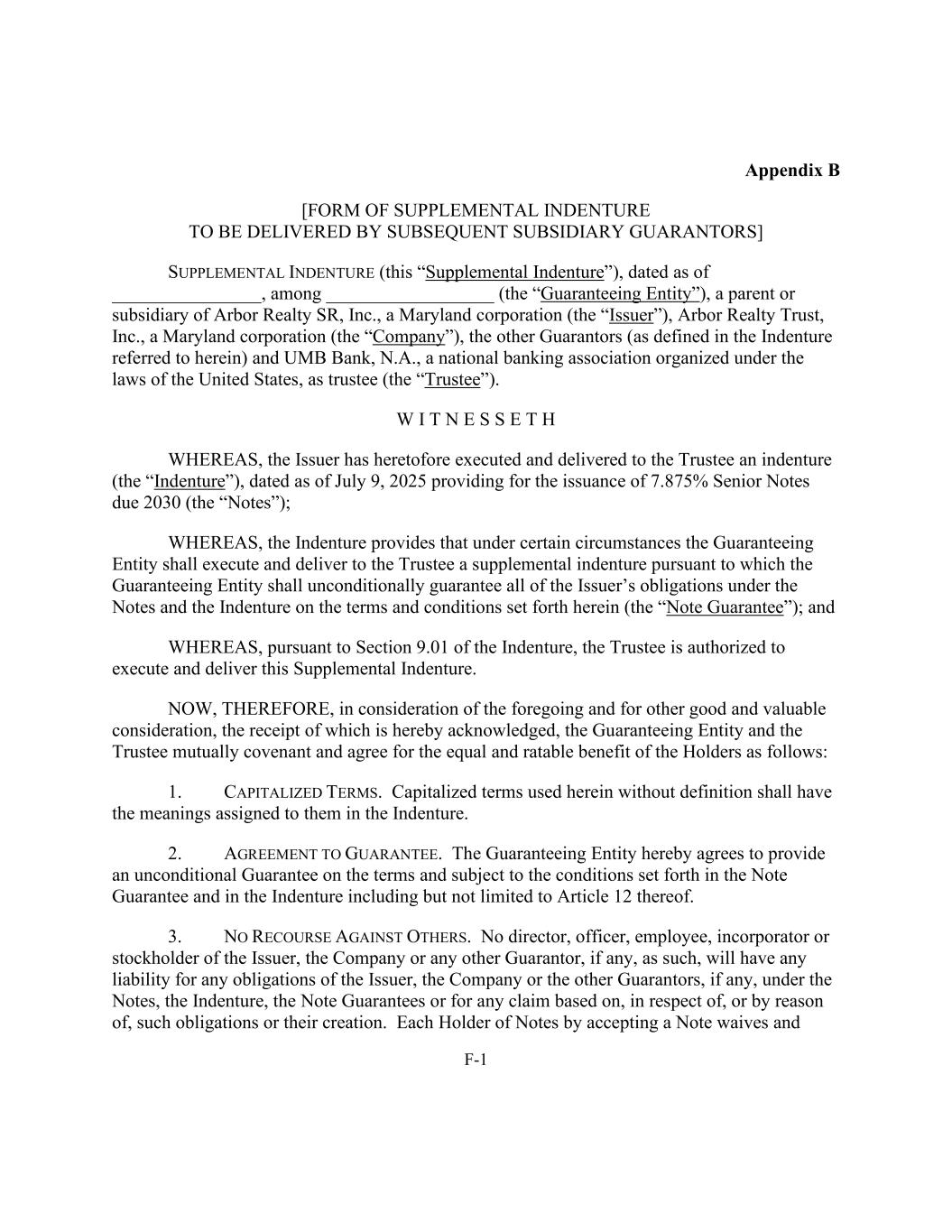 F-1附录B [由后续附属担保人交付的补充契约的形式]补充契约(此“补充契约”),日期为________________,在马里兰州公司Arbor Realty SR,Inc.(“发行人”)的母公司或子公司____________________(“担保实体”)、马里兰州公司(“公司”)的其他担保人(定义见此处提及的契约)和Arbor Realty Trust, Inc.鉴于发行人此前已签署并向受托人交付日期为2025年7月9日的契约(“契约”),规定发行于2030年到期的7.875%优先票据(“票据”);然而,契约规定,在某些情况下,担保实体应签署并向受托人交付补充契约,据此,担保实体应根据此处规定的条款和条件无条件地为发行人在票据和契约下的所有义务提供担保(“票据担保”);因此,根据义齿第9.01节,受托人被授权执行和交付此补充义齿。因此,考虑到上述情况和为其他良好和有价值的对价,特此确认收到,担保实体和受托人为了持有人的平等和可予评定的利益相互约定和约定如下:1。大写条款。此处使用的未经定义的大写术语应具有义齿中赋予它们的含义。2.同意担保。担保实体在此同意根据票据担保和契约中规定的条款和条件(包括但不限于第12条)提供无条件担保。3.对其他人没有追索权。发行人、公司或任何其他担保人(如有的话)本身的任何董事、高级人员、雇员、收入人或股东,将不会对发行人、公司或其他担保人(如有的话)在票据、义齿、票据担保项下的任何义务或基于、关于或由于此类义务或其创设的任何索赔承担任何责任。每名票据持有人透过接受票据豁免及