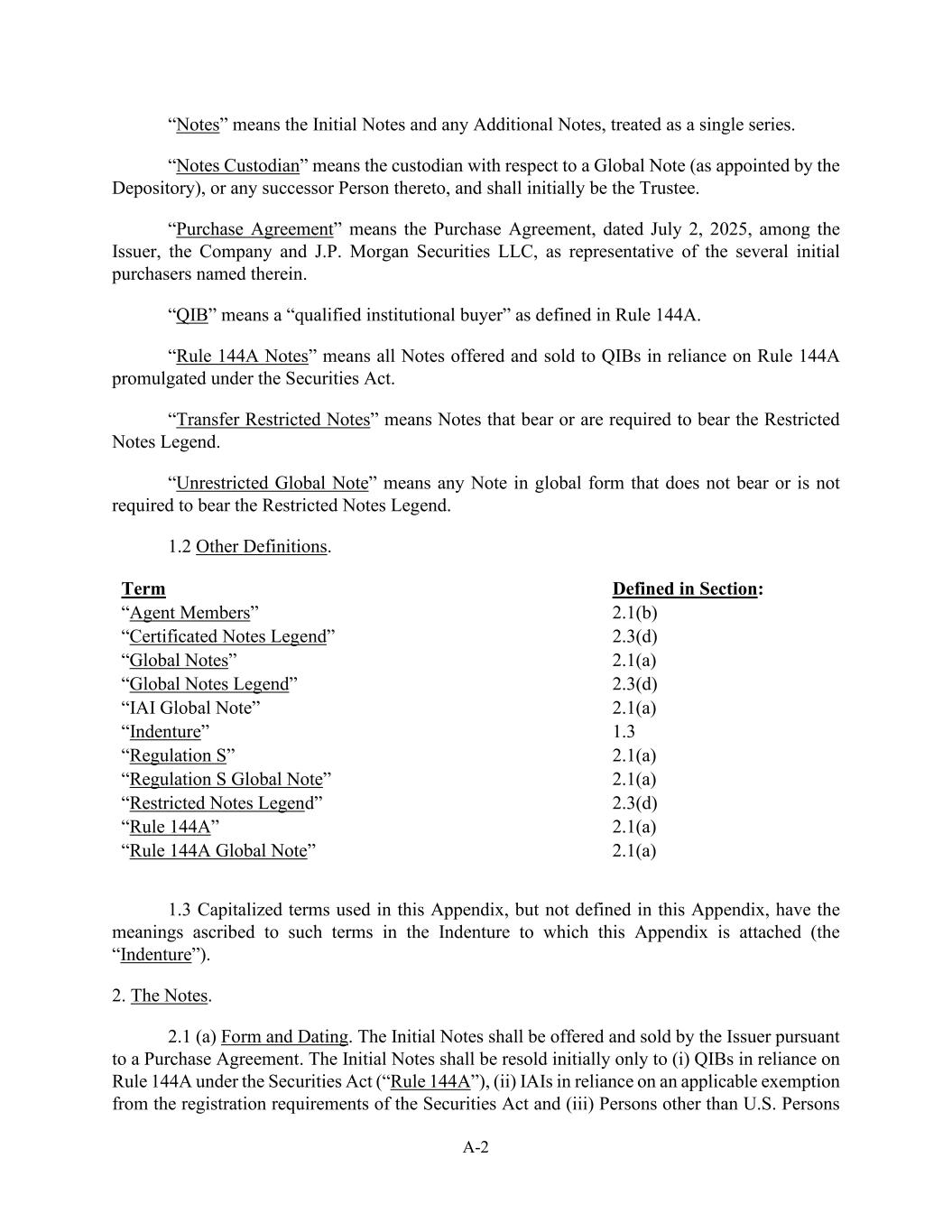 A-2“票据”是指初始票据和任何附加票据,作为单一系列处理。“票据托管人”是指全球票据的托管人(由存管人指定),或其任何继任者,最初应为受托人。“购买协议”是指发行人、公司和J.P. Morgan Securities LLC作为其中指定的几个初始购买者的代表于2025年7月2日签署的购买协议。“QIB”是指规则144A中定义的“合格机构买方”。“第144A条票据”是指依据《证券法》颁布的第144A条规则向QIB发售和出售的所有票据。“转让受限制票据”是指承担或被要求承担受限制票据图例的票据。“不受限制的全球票据”是指不承担或不需要承担受限制票据图例的任何全球形式的票据。1.2其他定义。第2.1节中定义的术语:“代理成员”2.1(b)“有证票据传奇”2.3(d)“全球票据传奇”2.1(a)“IAI全球票据传奇”2.3(d)“TERM0全球票据”2.1(a)“契约”1.3“S条例”2.1(a)“S条例全球票据”2.1(a)“限制性票据传奇”2.3(d)“规则144a”2.1(a)“规则144a全球票据”2.1(a)1.3本附录中使用但未在本附录中定义的大写术语具有本附录所附契约(“契约”)中赋予此类术语的含义。2.笔记。2.1(a)形式和日期。初始票据应由发行人根据购买协议发售和出售。初始票据最初仅应转售给(i)依据《证券法》第144A条(“第144A条”)的QIB,(ii)依据《证券法》注册要求的适用豁免的IAI,以及(iii)美国人以外的人