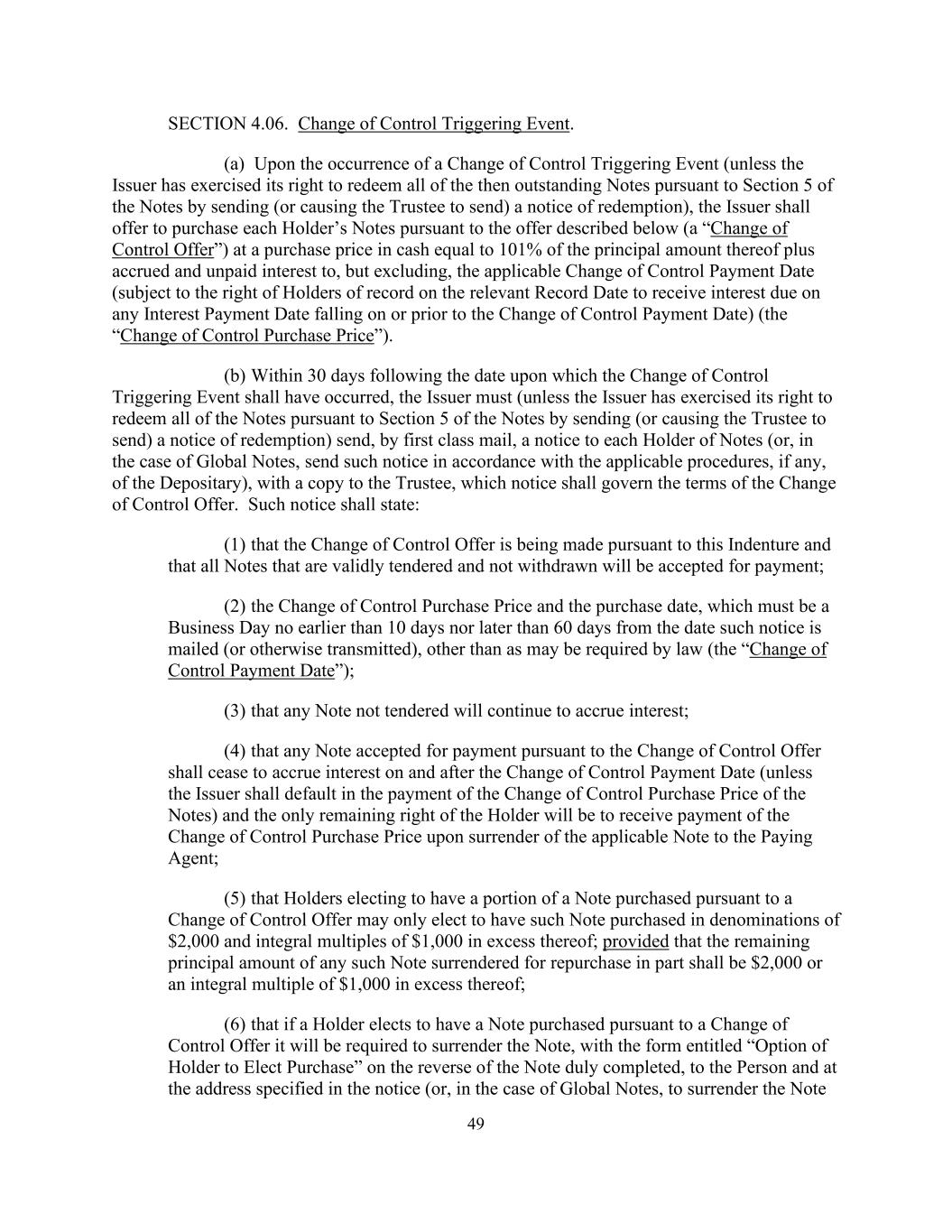 49第4.06款。控制权变更触发事件。(a)一旦发生控制权变更触发事件(除非发行人已根据票据第5条行使其权利以发送(或促使受托人发送)赎回通知的方式赎回所有当时未偿还的票据),发行人应根据下述要约(“控制权变更要约”)提出购买每一持有人的票据,购买价格为现金,相当于其本金的101%加上应计未付利息,但不包括,适用的控制权变更支付日(受限于相关记录日的记录持有人有权收取在控制权变更支付日或之前的任何利息支付日到期的利息)(“控制权变更购买价格”)。(b)在控制权变更触发事件发生之日后30天内,发行人必须(除非发行人已通过发送(或促使受托人发送)赎回通知的方式根据票据第5节行使其赎回所有票据的权利)以第一类邮件向每个票据持有人发送一份通知(或在全球票据的情况下,按照存托人的适用程序(如有)发送该通知),并将一份副本发送给受托人,控制权变更要约的条款应以该通知为准。该通知应说明:(1)控制权变更要约正依据本契约作出,所有有效投标且未撤回的票据将被接受付款;(2)控制权变更购买价格和购买日期,必须是自该通知邮寄(或以其他方式传送)之日起不早于10日或不迟于60日的营业日,法律可能要求的(“控制权变更支付日”)以外;(3)任何未投标的票据将继续产生利息;(4)根据控制权变更要约获接纳支付的任何票据,须于控制权变更支付日及之后停止计息(除非发行人未能支付票据的控制权变更购买价款),而持有人的唯一剩余权利将是在向付款代理交出适用票据时收取控制权变更购买价款;(5)选择根据控制权变更要约购买票据的一部分的持有人,只能选择以面值2,000美元和超过其1,000美元的整数倍购买该票据;但任何该等票据的剩余本金须为部分交回以进行回购的2,000美元或超过其1,000美元的整数倍;(6)如持有人选择根据控制权变更要约购买票据,则须交出该票据,以妥为填妥的票据反面题为“持有人选择购买”的表格,向该人及在通知中指明的地址(或,就全球票据而言,交出票据