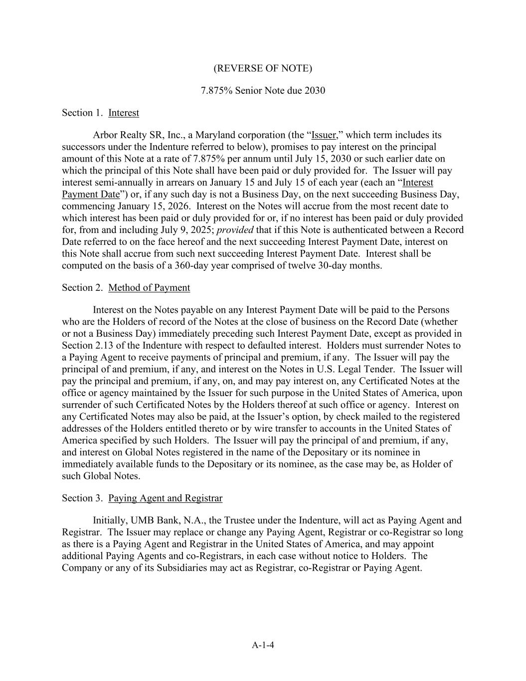 A-1-4(附注反覆)于2030年到期的7.875%优先票据第1款。Interest Arbor Realty SR,Inc.,a Maryland corporate(the“Issuer”,which term includes its successors under the Indenture under the below mentioned),promises to pay the interest on the principal amount of this Note at a rate of 7.875% per year until July 15,2030 or such a earlier date that the principal of this Note shall have been paid or detailed provided发行人将于每年的1月15日及7月15日(各为“付息日”)或(如任何该等日并非营业日)于下一个营业日(即自2026年1月15日起)支付每半年一次的利息。票据的利息将自已支付利息或已妥为提供利息的最近日期起计,如未支付利息或已妥为提供利息,则自2025年7月9日(含)起计;但如果本票据在本文件所述的记录日期与下一个利息支付日期之间进行认证,则本票据的利息将自该下一个利息支付日期起计。利息应按一年360天计算,由十二个30天的月份组成。第2节。任何利息支付日期的应付票据利息的支付方法将于紧接该利息支付日期之前的记录日期(不论是否为营业日)的营业结束时支付予作为票据记录持有人的人,但义齿第2.13节中有关违约利息的规定除外。持有人必须将票据交还给付款代理人,以接收本金和溢价的付款(如果有的话)。发行人将在美国法定招标中支付票据的本金和溢价(如有)以及利息。发行人将在发行人在美利坚合众国为此目的维持的办事处或代理机构在该办事处或代理机构交出任何凭证式票据时,就该等凭证式票据支付本金及溢价(如有的话),并可就该等凭证式票据支付利息。任何凭证式票据的利息也可由发行人选择,通过邮寄至有权获得该票据的持有人的注册地址的支票或通过电汇至这些持有人指定的美利坚合众国账户的方式支付。发行人将向作为该等全球票据持有人的存托人或其代名人(视情况而定)支付以存托人或其代名人名义登记的全球票据的本金和溢价(如有)以及立即可用资金的利息。第3节。付款代理和注册商最初,Indenture下的受托人UMB银行,N.A.将担任付款代理和注册商。发行人可以更换或变更任何付款代理人、注册人或共同注册人,只要在美利坚合众国有付款代理人和注册人,并可以指定额外的付款代理人和共同注册人,在每种情况下均无须通知持有人。本公司或其任何附属公司可担任注册处处长、共同注册处处长或付款代理人。
