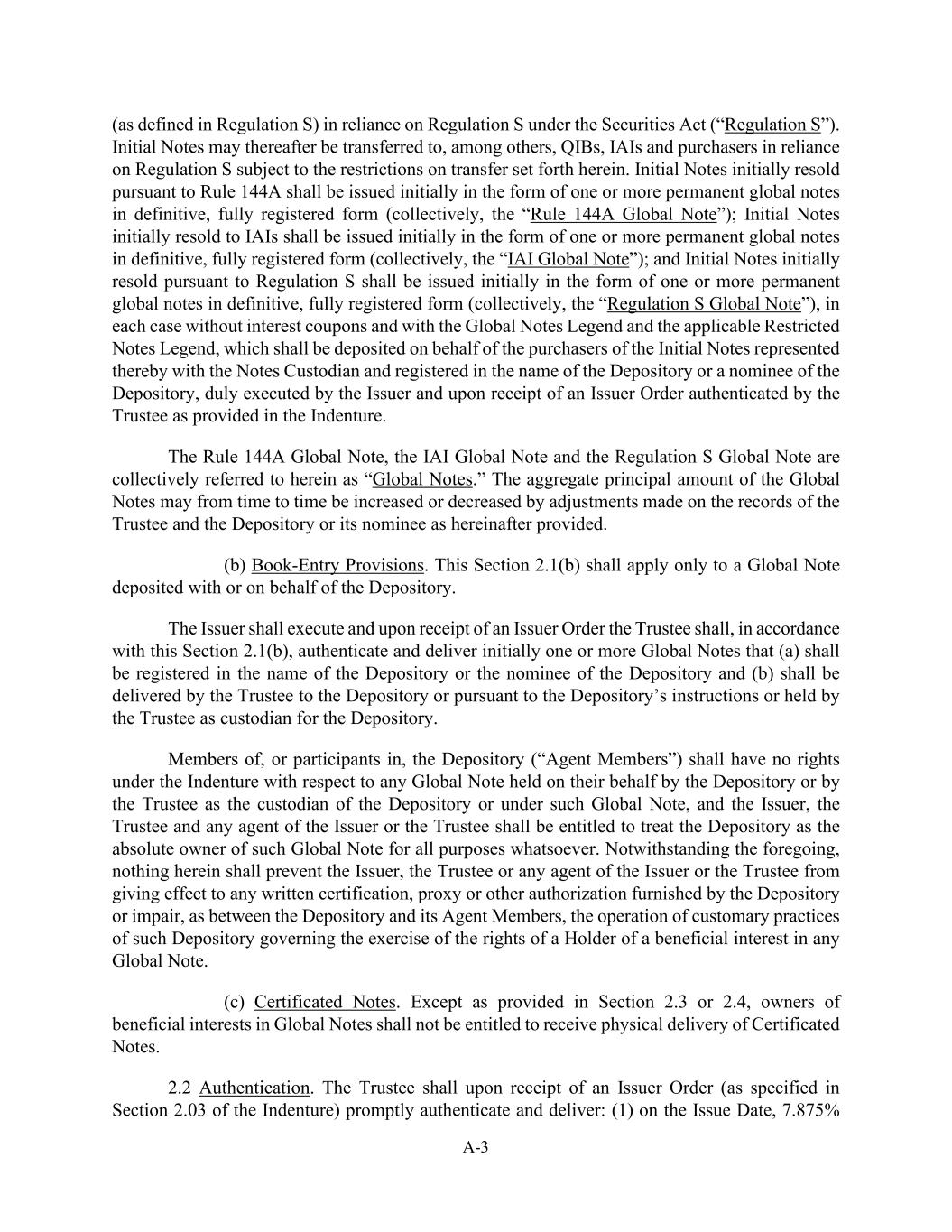 A-3(定义见条例S)依赖《证券法》(“条例S”)下的条例S。此后,初始票据可依据S条例转让给(其中包括)QIB、IAI和购买者,但须遵守此处规定的转让限制。根据第144A条规则最初转售的初始票据最初应以一种或多种最终、完全注册形式的永久性全球票据(统称“第144A条全球票据”)的形式发行;最初转售给国际投资机构的初始票据最初应以一种或多种最终、完全注册形式的永久性全球票据(统称“IAI全球票据”)的形式发行;根据S条例最初转售的初始票据最初应以一种或多种最终、完全注册形式的永久性全球票据(统称“S条例全球票据”)的形式发行,在每种情况下,不带息票,并与全球票据传奇和适用的限制性票据传奇一起存放,这些票据应代表由此代表的初始票据的购买者存放在票据托管人处,并登记在存管人或存管人的代名人名下,由发行人正式签署,并在收到受托人根据义齿规定认证的发行人命令后。规则144a全球票据、IAI全球票据和条例S全球票据在此统称为“全球票据”。根据以下规定,全球票据的本金总额可不时通过对受托人和存管人或其代名人的记录所作的调整而增加或减少。(b)记账条款。本条第2.1(b)款仅适用于存放于存管人或代表存管人存放的全球票据。发行人应执行并在收到发行人命令后,受托人应按照本条第2.1(b)款认证并初步交付一张或多张全球票据,其中(a)应以存管人或存管人代名人的名义登记,(b)应由受托人交付存管人或根据存管人的指示或由受托人作为存管人的托管人持有。存管人的成员或参与者(“代理成员”)对由存管人或作为存管人托管人的受托人代表其持有的任何全球票据或根据该全球票据持有的任何全球票据,在义齿下不享有任何权利,而发行人、受托人和发行人或受托人的任何代理人应有权为任何目的将存管人视为该全球票据的绝对所有者。尽管有上述规定,本文中的任何内容均不得阻止发行人、受托人或发行人的任何代理人或受托人对保存人提供的任何书面证明、代理或其他授权生效,或在保存人与其代理成员之间损害该保存人关于行使任何全球票据实益权益持有人权利的习惯做法的运作。(c)凭证式票据。除第2.3节或2.4节规定的情况外,全球票据的实益权益所有人无权接收凭证式票据的实物交割。2.2认证。受托人在收到发行人指令(如义齿第2.03节规定)后,应及时认证并交付:(1)在发行日,7.875%