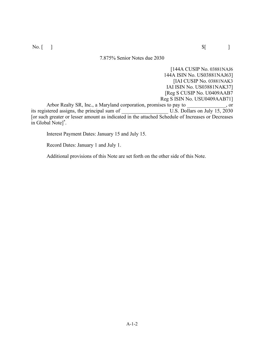 A-1-2号。[ ] $ [ ] 7.875%于2030年到期的优先票据[ 144A CUSIP No. 03881NAJ6 144A ISIN No。US03881NAJ63 ] [ IAICUSIP编号03881NAK3 IAI ISIN No。US03881NAK37 ] [ Reg S CUSIP编号。U0409AAB7 Reg S ISIN No。USU0409AAB71 ]马里兰州公司Arbor Realty SR,Inc.承诺于2030年7月15日向__________________或其注册受让人支付本金金额__________________美元[或所附全球票据增减附表所示的更多或更少的金额]*.付息日期:1月15日、7月15日。备案日期:1月1日、7月1日。本说明的其他规定载于本说明的另一面。