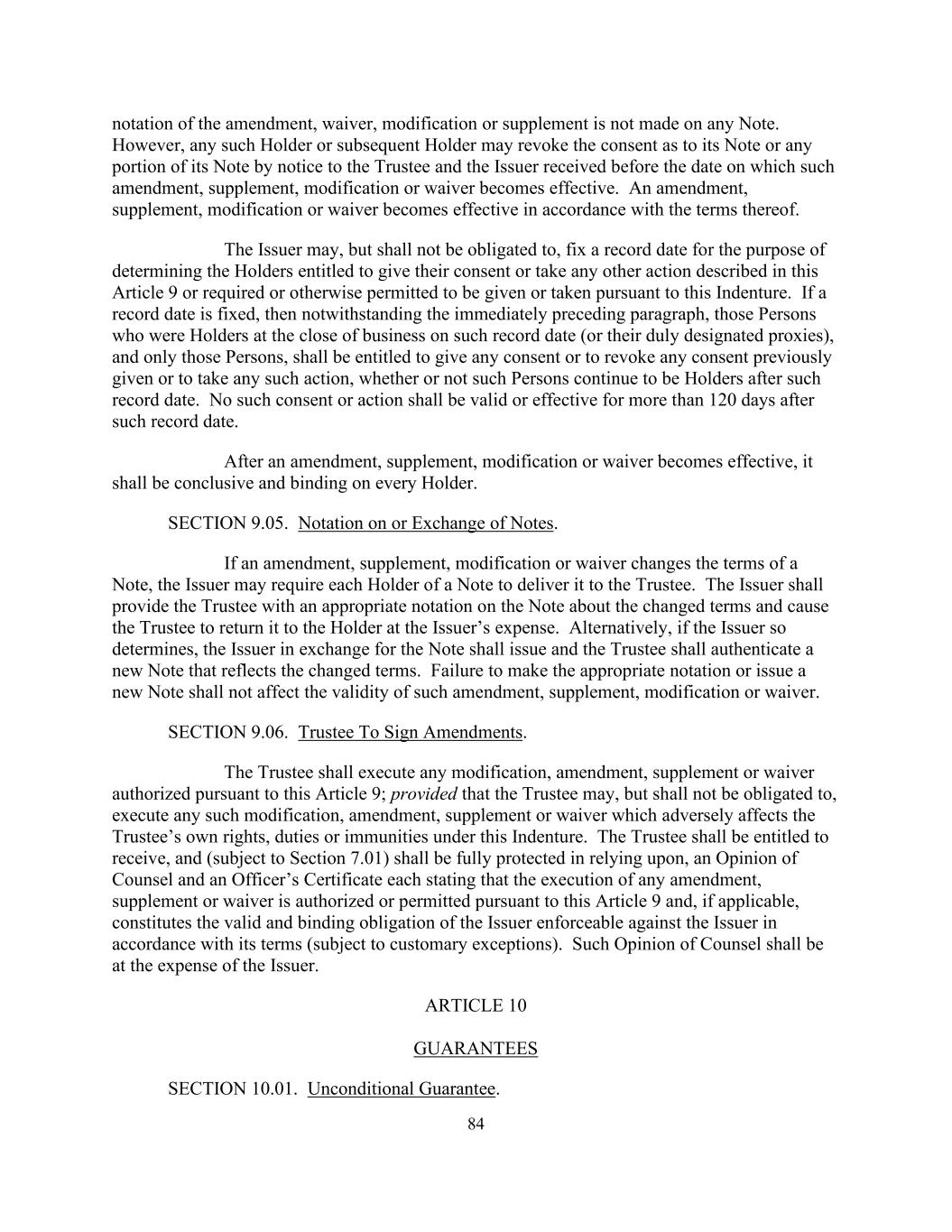 84修订、放弃、修改或补充的记号不在任何附注上作出。然而,任何该等持有人或其后的持有人可藉向受托人及在该等修订、补充、修改或放弃生效日期前收到的发行人发出通知,撤销对其票据或其票据任何部分的同意。修订、补充、修改或放弃根据其条款生效。发行人可以但无义务确定一个记录日期,以确定有权给予其同意或采取本条第9条所述或根据本契约要求或以其他方式允许给予或采取的任何其他行动的持有人。如果一个记录日期是固定的,那么尽管有前款的规定,那些在该记录日期营业结束时是持有人的人(或其正式指定的代理人),并且只有这些人,才有权给予任何同意或撤销先前给予的任何同意或采取任何此类行动,无论这些人在该记录日期之后是否继续是持有人。该同意或行动不得在该记录日期后超过120天内有效或有效。修改、补充、变更或者放弃生效后,具有结论性,对每一持有人具有约束力。第9.05节。票据上的记号或交换。如修订、补充、修改或豁免更改票据的条款,发行人可要求票据的每一持有人将其交付受托人。发行人应在票据上向受托人提供有关变更条款的适当注释,并促使受托人将其退还给持有人,费用由发行人承担。或者,如果发行人如此确定,作为票据交换的发行人应发行并由受托人认证反映变更条款的新票据。未能作出适当的记号或发出新的说明,不影响该等修订、补充、修改或放弃的有效性。第9.06节。受托人签署修订。受托人应执行依据第9条授权的任何变更、修改、补充或放弃;但受托人可以但无义务执行任何此类对受托人自身在本契约下的权利、义务或豁免产生不利影响的变更、修改、补充或放弃。受托人有权收到律师的意见和一份高级职员证书,并(在不违反第7.01条的情况下)在依赖时得到充分保护,其中分别说明任何修订、补充或放弃的执行是根据本条第9条授权或允许的,并在适用的情况下构成发行人根据其条款可对发行人强制执行的有效和具有约束力的义务(除习惯例外情况外)。律师的这种意见应由发行人承担费用。第10条保证第10.01款。无条件保证。