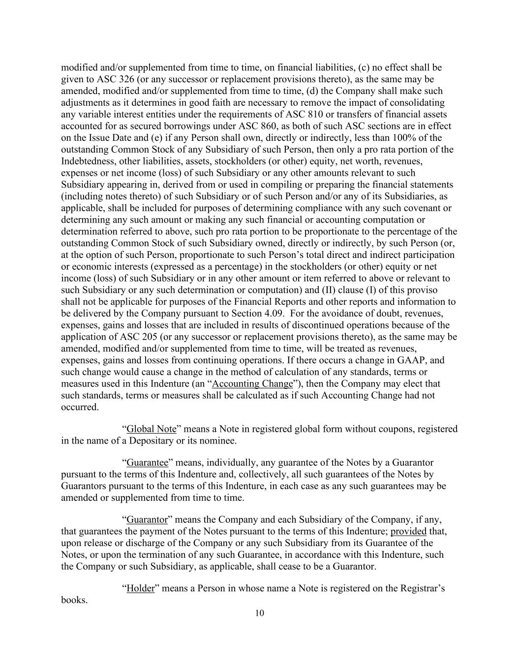 10不时修改和/或补充,对于金融负债,(c)不影响ASC 326(或其任何继承或替代条款),因为该等条款可能会不时修改、修改和/或补充,(d)公司应善意地作出其认为必要的调整,以消除根据ASC 810的要求合并任何可变利益实体或根据ASC 860作为担保借款入账的金融资产转让的影响,由于这两个ASC部分在发行日均有效,并且(e)如果任何人直接或间接拥有该人任何子公司的已发行普通股不足100%,则仅拥有该子公司的债务、其他负债、资产、股东(或其他)权益、净值、收入、费用或净收入(亏损)的按比例部分,或出现在以下各项中的与该子公司相关的任何其他金额,源自或用于编制或编制该附属公司或该个人及/或其任何附属公司(如适用)的财务报表(包括其附注),为确定遵守任何该等契诺或确定任何该等金额或作出上述任何该等财务或会计计算或确定的目的,应包括该按比例按该部分与该个人直接或间接拥有的该附属公司已发行普通股的百分比成比例(或由该个人选择,与该人在该附属公司的股东(或其他)权益或净收益(亏损)或上述任何其他金额或项目或与该附属公司或任何该等确定或计算有关的任何其他金额或项目中的直接和间接参与或经济利益总额(以百分比表示)成比例)和本但书(II)条第(i)款不适用于公司根据第4.09节将交付的财务报告和其他报告及信息。为免生疑问,因适用ASC 205(或其任何后续或替代条款)而计入已终止经营业绩的收入、费用、损益(其可能不时修订、修改和/或补充)将作为持续经营业务的收入、费用、损益处理。如果GAAP发生变化,且此类变化将导致本义齿中使用的任何标准、条款或措施的计算方法发生变化(“会计变更”),则公司可以选择将此类标准、条款或措施的计算视为未发生此类会计变更。“全球票据”是指以记名全球形式的无息票的票据,以存托人或其代名人的名义登记。“担保”个别指担保人根据本契约条款对票据的任何担保,统称为担保人根据本契约条款对票据的所有此类担保,在每种情况下,任何此类担保可能会不时修改或补充。「担保人」指公司及公司各附属公司(如有的话)根据本契约的条款担保票据的支付;条件是,一旦公司或任何该等附属公司解除或解除其对票据的担保,或在任何该等担保终止时,根据本契约,该公司或该附属公司(如适用)将不再是担保人。“持有人”是指票据以其名义登记在注册官账簿上的人。