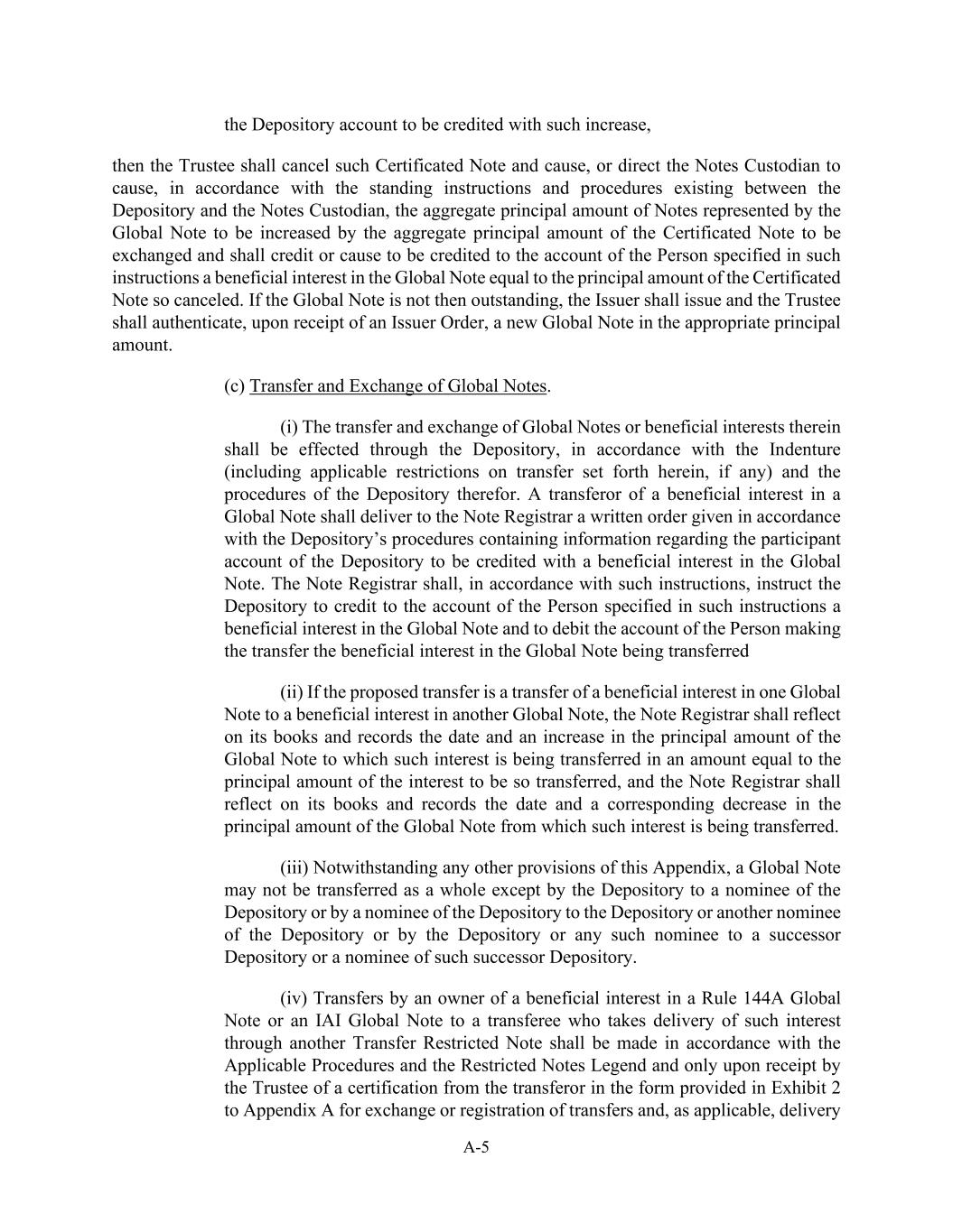 A-5记入该等增加的存管账户,则受托人应根据存管人与票据托管人之间现有的常设指示和程序,注销该等凭证式票据并促使,或指示票据托管人促使,全球票据所代表的票据本金总额将增加待交换的凭证式票据的本金总额,并应将全球票据的实益权益记入或促使记入该等指示中指明的人的账户,该实益权益等于如此注销的凭证式票据的本金。如果全球票据当时没有未偿付,则发行人应在收到发行人订单后发行且受托人应认证本金金额适当的新全球票据。(c)全球票据的转让和交换。(i)全球票据或其中的实益权益的转让和交换应通过保存人,按照义齿(包括此处规定的适用的转让限制,如果有)和保存人的程序进行。全球票据实益权益的转让人应向票据登记处提交一份按照存管人程序发出的书面命令,其中应载有关于存管人参与人账户的信息,以便记入全球票据实益权益的贷方。票据书记官长应根据该等指示,指示存管人将全球票据的实益权益记入该等指示中指明的人的账户,并将所转让的全球票据的实益权益借记于进行转让的人的账户(ii)如果拟议转让是将一张全球票据的实益权益转让给另一张全球票据的实益权益,票据注册处处长须在其帐簿及纪录上反映该等利息正被转移至的全球票据的日期及本金的增加,金额相等于将被如此转移的利息的本金,而票据注册处处长须在其帐簿及纪录上反映该等利息正被转移至的全球票据的日期及本金的相应减少。(iii)尽管有本附录的任何其他规定,全球票据不得整体转让,除非由保存人转让予保存人的代名人,或由保存人的代名人转让予保存人或保存人的另一代名人,或由保存人或任何该等代名人转让予继任保存人或该继任保存人的代名人。(iv)第144A条规则的全球票据或IAI全球票据的实益权益所有人向通过另一转让收取该权益的受让人进行的转让限制性票据应按照适用程序和限制性票据图例进行,且仅应在受托人收到转让人以附录A的附件A的附件2中提供的格式提供的证明后,方可进行转让的交换或登记,并在适用的情况下交付