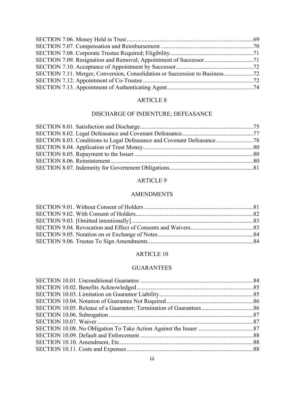 三、第7.06节。以信托方式持有的款项.....................................................................................69第7.07条。补偿和偿还......................................................................70第7.08条。所需的公司受托人;资格..................................................................71第7.09条。辞职和免职;任命继任者.................................71第7.10条。继任者接受聘任...................................................................72第7.11条。合并、转换、合并或继承业务....................72第7.12条。委任共同受托人...................................................................................72第7.13条。指定鉴证代理人....................................................................74条第八条解除契约;抗辩第8.01款。满意与解除....................................................................................75第8.02条。法律失责及契约失责.................................................77第8.03条。法定撤销和盟约撤销的条件......................78第8.04条。信托资金的运用....................................................................................80第8.05条。偿还发行人的款项................................................................................................80第8.06节。恢复原状................................................................................................80第8.07条。对政府义务的赔偿......................................................81第九条修正第9.01款。未经持有人同意.....................................................................................81第9.02条。经持有人同意.......................................................................................82第9.03条。【故意省略】..................................................................................83第9.04条。撤销及同意和放弃的效力.......................................83第9.05条。票据上的记号或交换.......................................................................84第9.06条。受托人签署修订.......................................................................................84第10条保证第10.01条。无条件保证.......................................................................84第10.02条。惠益确认......................................................................................85第10.03节。担保人责任的限制.......................................................................85第10.04条。不需要担保的记号.....................................................................86第10.05条。解除担保人;担保的终止...................................86第10.06条。代位权...................................................................................87第10.07条。豁免.................................................................................................................87第10.08条。没有义务对发行人采取行动.....................................87第10.09条。违约和强制执行...................................................................................88第10.10条。修正案等...................................................................................................88第10.11条。成本费用.....................................................................................................88