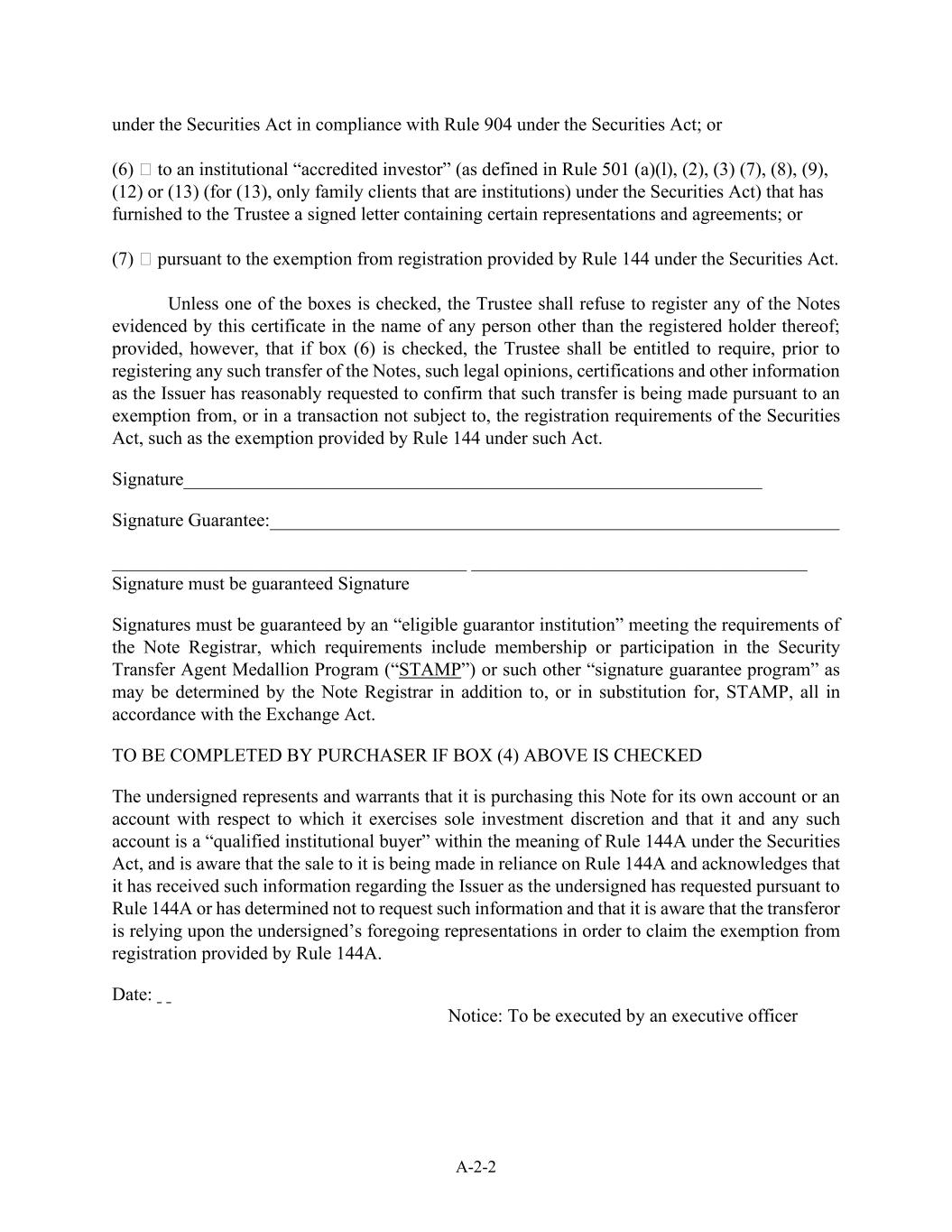 符合《证券法》第904条规则的《证券法》下的A-2-2;或(6)向已向受托人提供载有某些陈述和协议的已签署信函的机构“认可投资者”(定义见《证券法》第501(a)(l)、(2)、(3)(7)、(8)、(9)、(12)或(13)(仅针对《证券法》下属于机构的家庭客户);或(7)根据《证券法》第144条规定的注册豁免。除非选中其中一个方框,否则受托人应拒绝将本证书所证明的任何票据以其已登记持有人以外的任何人的名义登记;但条件是,如果选中了方框(6),则受托人有权在登记票据的任何此类转让之前要求发行人合理要求的法律意见、证明和其他信息,以确认此类转让是根据《证券法》的登记要求的豁免进行的,或在不受《证券法》登记要求约束的交易中进行的,例如规则144根据该法案规定的豁免。签名________________________________________________________________________________________________________________________________________________________________________________________________________________________________________________________________________________________________________________________________________________________________________________________________________________________________________________________________________________________________________________________________________________________________________________________________________________________________________________________________________________________________________________________________________________________________________________________________________如上述第(4)条被选中,则由买方完成,以下签署人声明并保证,其为自己的账户或其行使单独投资酌情权的账户购买本票据,且其和任何此类账户是《证券法》第144A条所指的“合格机构买方”,并且知道向其出售是依据规则144A进行的,并承认其已收到以下签署人根据规则144A要求的有关发行人的信息或已确定不要求提供此类信息,并且其知道转让人正在依赖以下签署人的上述陈述以主张规则144A提供的免于登记。日期:通知:将由执行人员执行