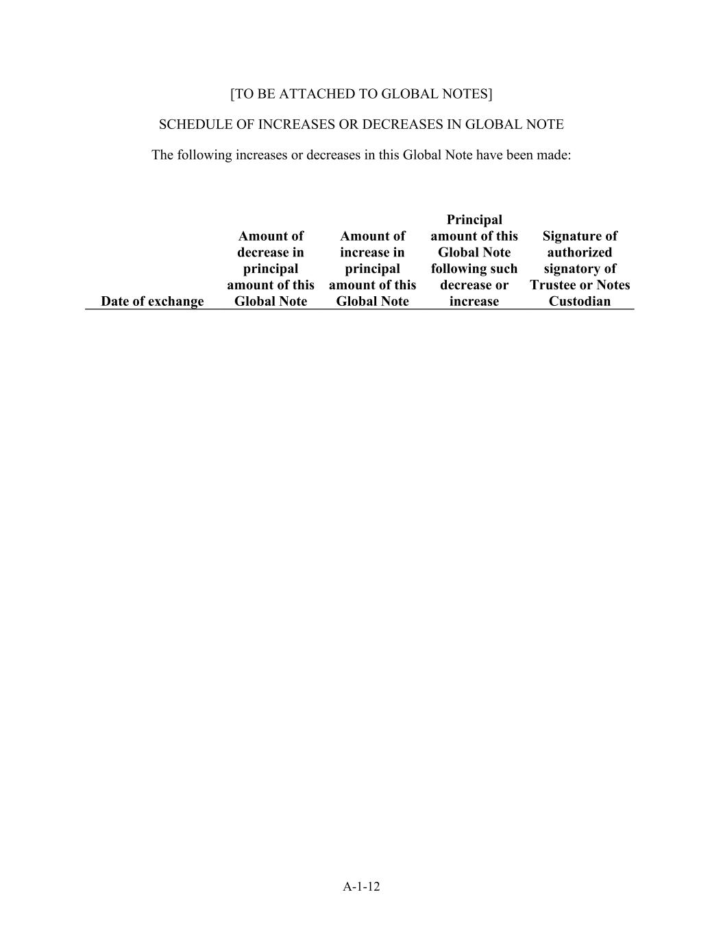 A-1-12 [将附于全球票据]全球票据增减的附表本全球票据的增减情况如下:兑换日期本全球票据本金减少额本全球票据本金增加额在该减少或增加后的本全球票据本金增加额受托人或票据托管人的授权签字人签名