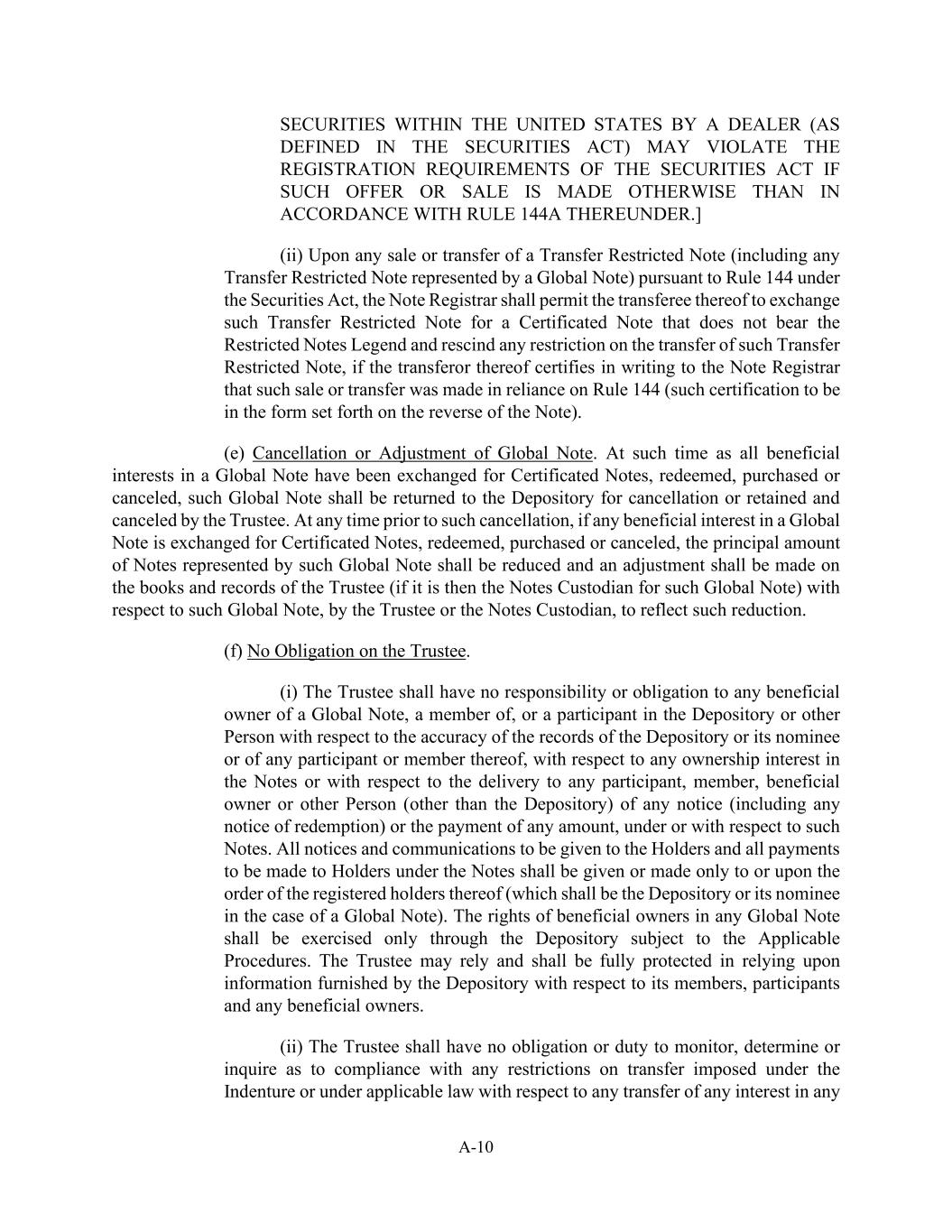 交易商在美国境内的A-10证券(如《证券法》中所定义),如果此类要约或出售不是根据其规则144a进行的,则可能违反《证券法》的登记要求。](ii)在根据《证券法》第144条出售或转让转让受限制票据(包括全球票据所代表的任何转让受限制票据)时,票据注册处处长须准许其受让人将该等转让受限制票据交换为不载有受限制票据图例的凭证式票据,并撤销对该等转让受限制票据的转让的任何限制,但如该等转让人向票据注册处处长书面证明该等出售或转让是依据第144条作出的(该等证明须采用票据反面所载的格式)。(e)取消或调整全球票据。当全球票据的所有实益权益已被交换为凭证式票据、赎回、购买或注销时,该全球票据应退还存管人以供注销或由受托人保留并注销。在注销前的任何时间,如全球票据的任何实益权益被交换为凭证式票据、赎回、购买或注销,则该全球票据所代表的票据本金金额应予减少,并应由受托人或票据托管人就该全球票据对受托人(如果当时是该全球票据的票据托管人)的簿册和记录作出调整,以反映该减少。(f)对受托人没有义务。(i)受托人对全球票据的任何实益拥有人、存管人的成员、或存管人的参与者或其他人的记录的准确性,对票据的任何所有权权益,或对根据或就该等票据向任何参与者、成员、实益拥有人或其他人(存管人除外)交付任何通知(包括任何赎回通知)或支付任何金额,不承担任何责任或义务。根据票据须向持有人发出的所有通知及通讯,以及须向持有人作出的所有付款,均须只向或按票据的登记持有人(在全球票据的情况下为存管人或其代名人)发出或作出。受益所有人在任何全球票据中的权利应仅通过存管人行使,但须遵守适用的程序。受托人在依赖存管人就其成员、参与者和任何受益所有人提供的信息时,可以依赖并应得到充分保护。(ii)受托人并无义务或责任监察、厘定或查询根据义齿或根据适用法律就任何转让任何权益而施加的任何转让限制的遵守情况