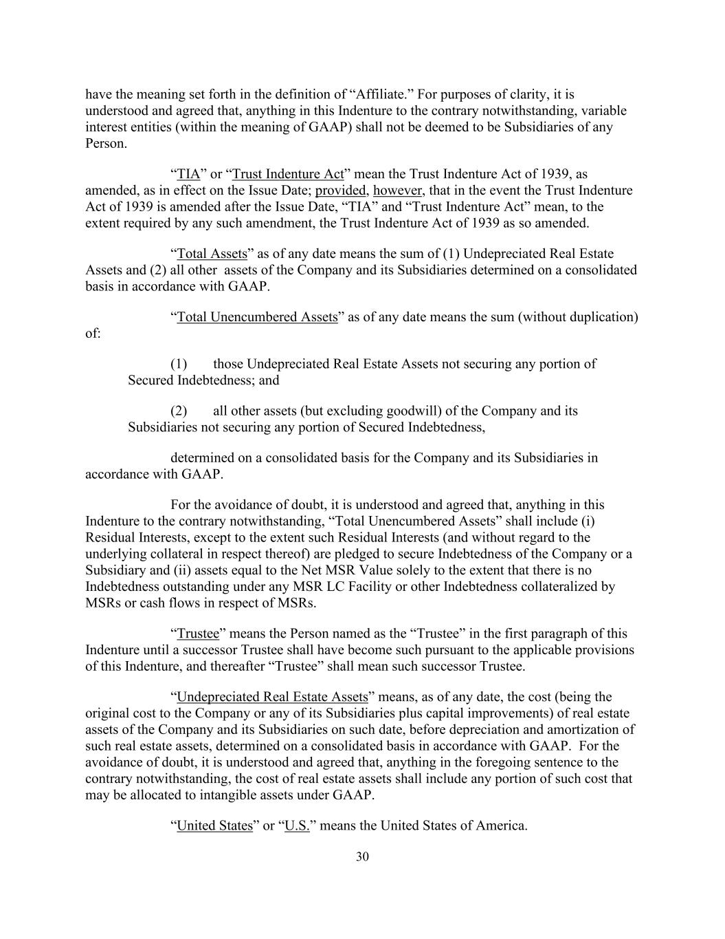 30具有“Affiliate”定义中规定的含义。为明确起见,理解并同意,尽管本契约中有任何与之相反的内容,可变利益实体(在GAAP的含义内)不应被视为任何人的子公司。“TIA”或“信托契约法”是指经修订的1939年《信托契约法》,自发布之日起生效;但前提是,如果1939年《信托契约法》在发布之日后得到修订,则“TIA”和“信托契约法”是指,在任何此类修订要求的范围内,经如此修订的1939年《信托契约法》。“总资产”指截至任何日期的(1)未折旧房地产资产和(2)公司及其子公司根据公认会计原则在合并基础上确定的所有其他资产之和。截至任何日期的“未设押资产总额”是指以下各项的总和(不重复):(1)那些未折旧的房地产资产没有为任何部分的有担保债务提供担保;(2)公司及其子公司的所有其他资产(但不包括商誉)没有为任何部分的有担保债务提供担保,根据公认会计原则在合并基础上为公司及其子公司确定。为免生疑问,理解并同意,尽管本契约中有任何相反的情况,“未设押资产总额”应包括(i)剩余权益,但此类剩余权益(且不考虑相关抵押品)被质押以担保公司或子公司的债务,以及(ii)仅在没有任何MSR LC融资项下的未偿债务或MSR抵押的其他债务或MSR相关的现金流的情况下,等于MSR净值的资产除外。“受托人”是指在本契约第一款中被指定为“受托人”的人,直到根据本契约的适用条款,继任受托人成为此类受托人为止,此后“受托人”是指该继任受托人。“未折旧房地产资产”是指,截至任何日期,公司及其子公司在该日期的房地产资产成本(即公司或其任何子公司的原始成本加上资本改良),在该等房地产资产折旧和摊销前,按照公认会计原则在综合基础上确定。为免生疑问,理解并一致认为,尽管上述句子中的任何内容与之相反,但房地产资产成本应包括此类成本中根据公认会计原则可能分配给无形资产的任何部分。“美国”或“美国”是指美利坚合众国。