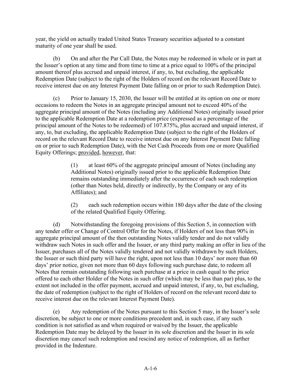 A-1-6年期,采用调整为一年固定期限的实际交易美国国债的收益率。(b)在票面赎回日期当日及之后,票据可由发行人选择在任何时间及不时以相当于其本金金额的100%加上应计及未付利息(如有的话)至适用赎回日期(但不包括)的价格全部或部分赎回(惟有关记录日期的记录持有人有权收取在该赎回日期或之前的任何利息支付日期到期的利息)。(c)在2030年1月15日之前,发行人将有权选择在一次或多次赎回本金总额不超过原于适用赎回日期前发行的票据(包括任何额外票据)本金总额的40%的票据,赎回价格(以将赎回的票据本金的百分比表示)为107.875%,加上应计及未付利息(如有)至但不包括,适用的赎回日期(取决于相关记录日期的记录持有人有权收取在该赎回日期或之前的任何利息支付日期到期的利息),以及来自一项或多项合格股票发行的现金收益净额;但前提是:(1)最初在适用的赎回日期之前发行的票据(包括任何额外票据)本金总额的至少60%在紧接每项该等赎回发生后仍未偿还(直接或间接持有的票据除外,由公司或其任何联属公司);及(2)每次该等赎回均于有关合资格股权发售截止日期后180日内发生。(d)尽管有本第5条前述规定,就票据的任何要约收购或控制权变更要约而言,如持有当时未偿还票据本金总额不少于90%的持有人有效投标,且在该要约中未有效撤回该等票据,而发行人或任何第三方代替发行人提出要约,购买该等持有人有效投标且未有效撤回的所有票据,则发行人或该第三方将有权,在不少于10天但不超过60天的事先通知下,在该购买日期后不超过60天给予赎回所有在该购买后仍未偿还的票据,其现金价格等于在该要约中向票据的其他持有人提供的价格(可能低于面值)加上(在不包括在要约付款中的范围内)应计和未付利息(如有),但不包括,兑付日(以相关登记日的记录持有人收取相关付息日到期利息的权利为准)。(e)根据本条第5款作出的任何赎回票据,可由发行人自行酌情决定受一项或多项先决条件规限,在此情况下,如任何该等条件未能按要求达成或由发行人放弃,则可由发行人自行酌情决定延迟适用的赎回日期,而发行人可自行决定取消该等赎回并撤销任何赎回通知,所有这些均在义齿中进一步规定。