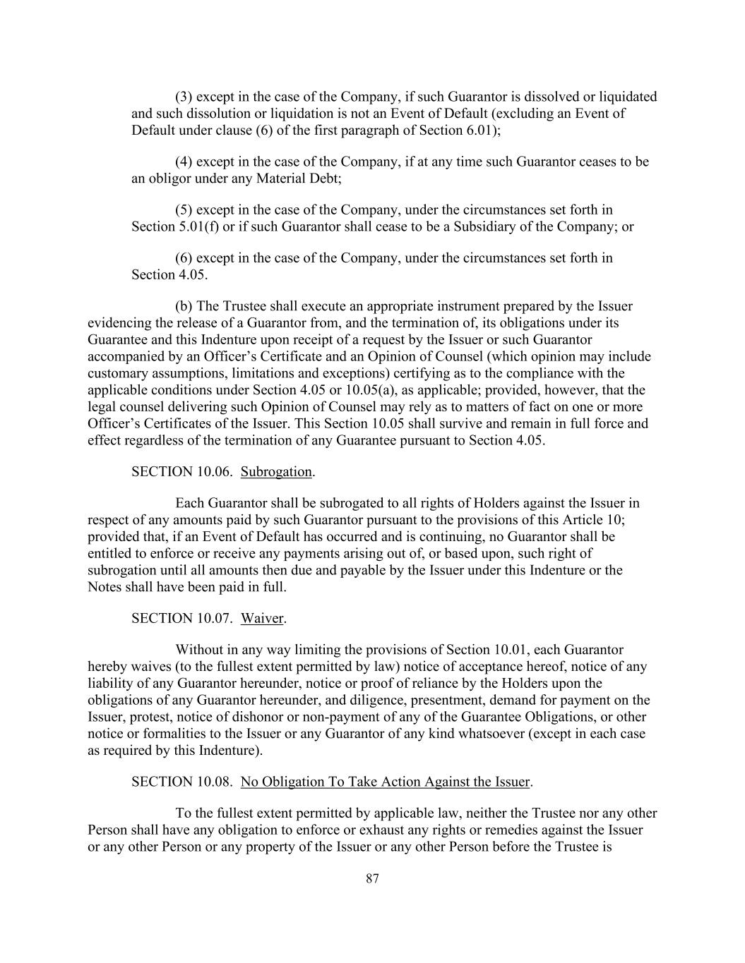 87(3)除公司的情况外,如该担保人已解散或清算,而该解散或清算并非违约事件(不包括根据第6.01条第1款第(6)款的违约事件);(4)除公司的情况外,如该担保人在任何时候不再是任何重大债务下的债务人;(5)除公司的情况外,在第5.01(f)条所列的情况下,或如该担保人不再是公司的附属公司;或(6)除公司的情况外,在第4.05条所列的情况下。(b)受托人应在收到发行人或该担保人的请求并附有高级职员证书和律师意见(该意见可能包括惯常的假设、限制和例外)证明符合第4.05或10.05(a)节规定的适用条件(如适用)后,签立由发行人准备的适当文书,证明担保人解除其在其担保和本义齿下的义务并终止其义务;但前提是,提供律师意见的法律顾问可就事实事项依赖发行人的一份或多于一份高级人员证明书。无论根据第4.05条终止任何担保,本条10.05均应继续有效,并保持完全有效。第10.06节。代位权。各担保人应就该担保人依据本条第10条的规定支付的任何款项向发行人代位行使持有人的所有权利;但如果违约事件已经发生并仍在继续,则任何担保人均无权强制执行或收取因该代位权而产生或基于该代位权而产生的任何款项,直至发行人根据本契约或票据当时到期应付的所有款项均已全额支付。第10.07节。豁免。在不以任何方式限制第10.01条的规定的情况下,各担保人特此放弃(在法律允许的最大范围内)接受本协议的通知、任何担保人在本协议项下的任何责任的通知、持有人对任何担保人在本协议项下的义务的依赖的通知或证明,以及对发行人的勤勉、提示、要求付款、抗诉、不履行或不支付任何担保义务的通知,或向发行人或任何种类的任何担保人的其他通知或手续(本契约要求的情况除外)。第10.08节。没有义务对发行人采取行动。在适用法律允许的最大范围内,受托人或任何其他人均无义务强制执行或用尽针对发行人或任何其他人的任何权利或补救措施或发行人或任何其他人的任何财产在受托人被
