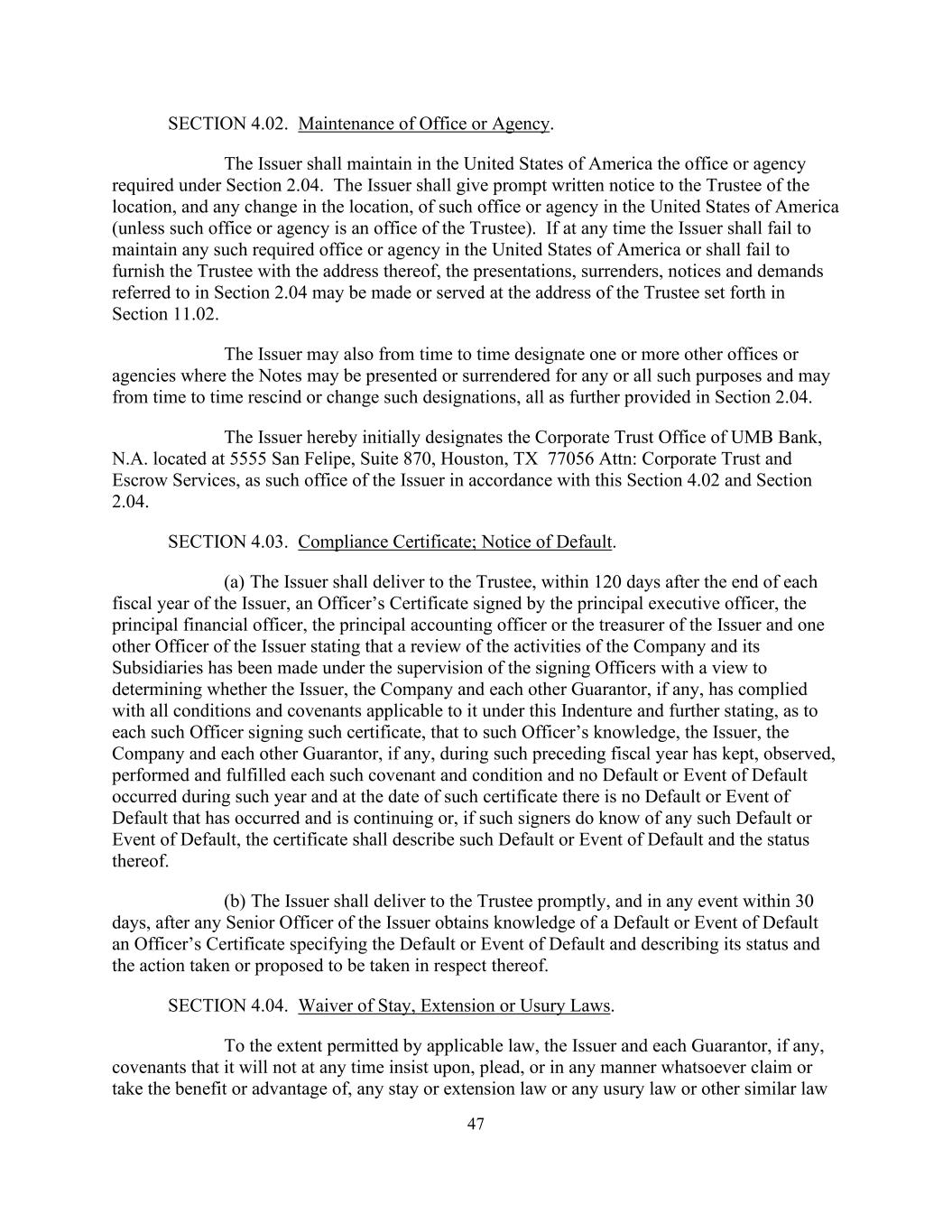 47第4.02条。办公室或机构的维护。发行人应在美利坚合众国维持第2.04条规定的办事处或机构。发行人应迅速向受托人发出书面通知,告知该办事处或代理机构在美利坚合众国的所在地以及所在地的任何变更(除非该办事处或代理机构是受托人的办事处)。如发行人在任何时间未能在美利坚合众国维持任何该等规定的办事处或机构,或未能向受托人提供其地址,则可按第11.02条所列受托人的地址作出或送达第2.04条所提述的陈述、交出、通知及要求。发行人还可不时指定一个或多个其他办事处或机构,在这些办事处或机构可为任何或所有此类目的出示或交出票据,并可不时撤销或更改此类指定,所有这些都在第2.04节中进一步规定。发行人特此根据本第4.02节和第2.04节初步指定位于5555 San Felipe,Suite 870,Houston,TX77056 ATTN:Corporate Trust and Escrow Services的UMB Bank,N.A.的公司信托办公室为发行人的此类办公室。第4.03节。合规证书;违约通知。(a)发行人须于发行人的每个财政年度结束后120天内,向受托人交付一份由发行人的首席执行官、首席财务官、首席会计官或司库以及发行人的另一名高级人员签署的高级人员证书,其中述明已在签署高级人员的监督下对公司及其附属公司的活动进行审查,以确定发行人、公司及彼此之间是否有任何担保人,已遵守根据本契约适用于其的所有条件及契诺,并就每名签署该证明书的该等高级人员进一步说明,据该高级人员所知,发行人、公司及其他担保人(如有的话)在该上一个财政年度内已备存、遵守、履行及达成每项该等契诺及条件,而在该年度内并无发生任何违约或违约事件,而在该证明书的日期,并无已发生及正在持续的违约或违约事件,如果此类签字人确实知道任何此类违约或违约事件,则证书应描述此类违约或违约事件及其状态。(b)发行人须在发行人的任何高级人员知悉违约或违约事件后,在任何情况下于30天内,迅速向受托人交付一份指明违约或违约事件的高级人员证书,并说明其状况以及就该事项所采取或拟采取的行动。第4.04节。放弃逗留、延期或高利贷法。在适用法律允许的范围内,发行人和每个担保人(如有)承诺,其在任何时候都不会坚持、抗辩或以任何方式主张或利用任何中止或延期法或任何高利贷法或其他类似法律