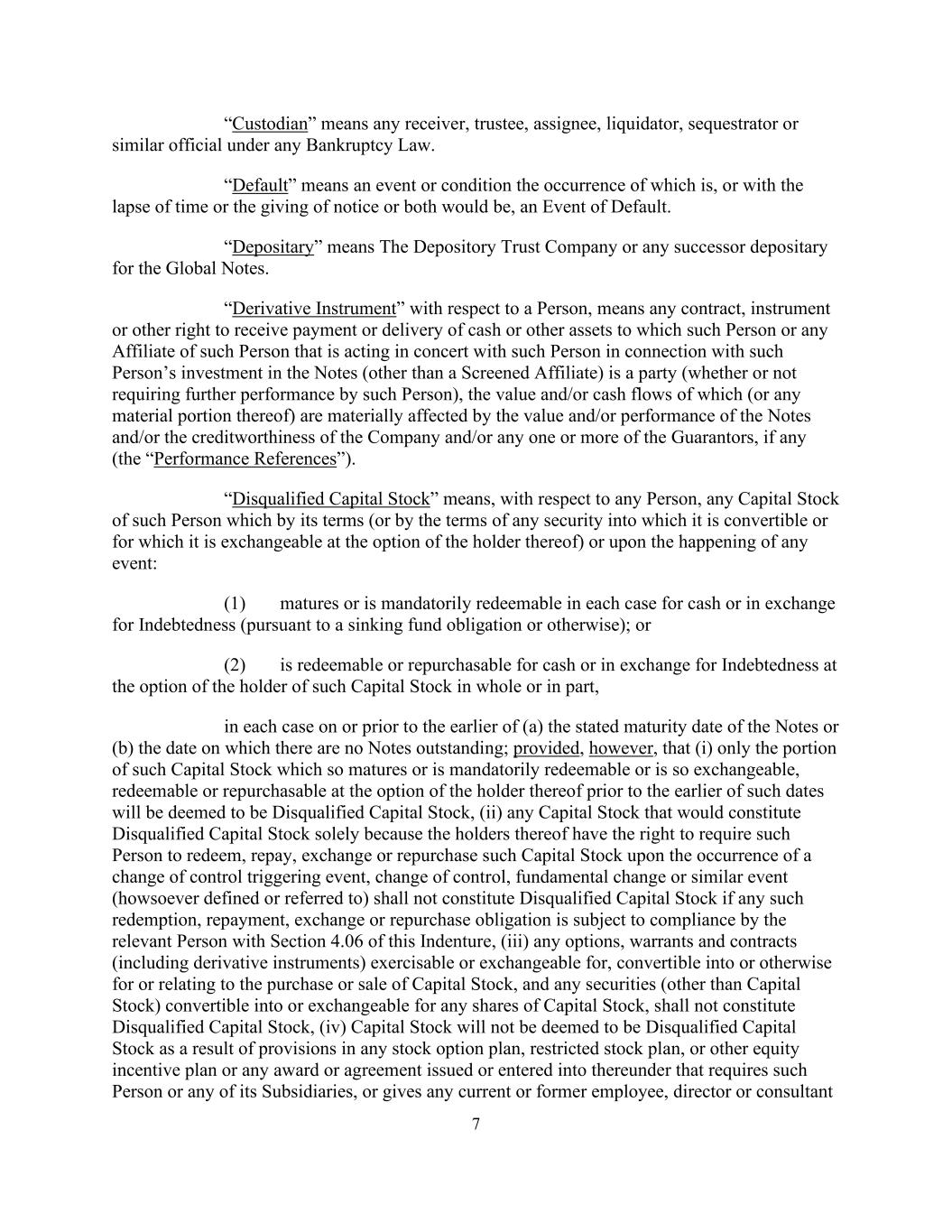 7“托管人”是指任何破产法下的任何接管人、受托人、受让人、清算人、扣押人或类似官员。“违约”是指发生的事件或条件,或随着时间的推移或通知的发出或两者兼而有之,即为违约事件。“存管人”是指全球票据的存管信托公司或任何后续存管人。就某人而言,“衍生工具”指任何合约、票据或其他收取现金或其他资产的权利,而该人或与该人一致行动的该人的任何关联公司就该人对票据的投资(经筛选的关联公司除外)是一方(无论是否要求该人进一步履行),票据的价值及/或表现及/或公司及/或任何一名或多于一名担保人(如有)的信誉度(「表现参考资料」)对其价值及/或现金流量(或其任何重要部分)造成重大影响。“不合格股本”是指,就任何人而言,根据其条款(或根据其可转换为或其持有人可选择交换的任何证券的条款)或在任何事件发生时:(1)到期或在每种情况下可强制赎回现金或交换债务(根据偿债基金义务或其他);或(2)可赎回或可回购现金或由该股本持有人选择全部或部分交换债务的任何股本,在每种情况下,在(a)票据的规定到期日或(b)没有未偿还票据的日期中较早者当日或之前;但条件是,(i)该股本中只有如此到期或可强制赎回或如此可交换、可赎回或可由其持有人选择在该等日期中较早者之前回购的部分将被视为不合格股本,(ii)任何股本仅因其持有人有权要求该人在发生控制权变更触发事件、控制权变更、根本变化或类似事件(无论定义或提及)时赎回、偿还、交换或回购该股本而构成不合格股本,如任何该等赎回、偿还、交换或回购义务须由有关人士遵守本契约第4.06条,(iii)任何可行使或可交换的期权、认股权证和合约(包括衍生工具),可转换为或以其他方式用于或与购买或出售股本有关,以及可转换为或交换为任何股本股份的任何证券(股本除外),均不构成不合格股本,(iv)股本不会因任何股票期权计划、限制性股票计划或其他股权激励计划或根据该计划发出或订立的任何奖励或协议中的规定而被视为不合格股本,或给予任何现任或前任雇员、董事或顾问