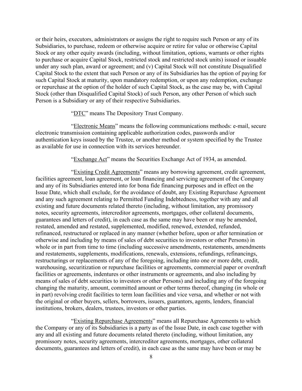 8或其继承人、遗嘱执行人、管理人或受让人有权要求此人或其任何子公司购买、赎回或以其他方式获得或退出价值或其他方式的股本或根据任何此类计划发行或可发行的任何其他股权奖励(包括但不限于期权、认股权证或购买或获得股本、限制性股票和限制性股票单位的其他权利),(v)股本将不构成不合格股本,前提是该人或其任何子公司有权在到期时、在强制赎回时或在该股本持有人(视情况而定)选择任何赎回、交换或回购时,以该人的股本(不合格股本除外)支付,该人是其子公司的任何其他人或其各自的任何子公司。“DTC”是指存托信托公司。“电子手段”是指以下通信方式:电子邮件、包含受托人签发的适用授权代码、密码和/或认证密钥的安全电子传输,或受托人指定的可供其在本协议项下的服务使用的其他方式或系统。“交易法”是指经修订的1934年《证券交易法》。「现有信贷协议」指公司及其任何附属公司为善意融资目的而订立并于发行日期生效的任何借款协议、信贷协议、融资协议、贷款协议或贷款融资及服务协议,为免生疑问,该等协议须排除任何现有回购协议及任何有关许可融资债务的该等协议,连同任何及所有与此有关的现有及未来文件(包括但不限于任何本票、担保协议、债权人间协议、抵押、其他抵押文件、担保及信用证),在每种情况下,可能已经或可能修订、重述、修订和重述、补充、修改、续期、延期、退款、再融资、重组或以任何方式(不论是在终止之前、终止时或之后或其他方式,包括通过向投资者或其他人出售债务证券的方式)全部或部分不时(包括连续修订、重述、修订和重述、补充、修改、续期、延期、退款、再融资、重组或替换上述任何一项,包括成为一项或多项债务、信贷、仓储、证券化或回购便利或协议,商业票据或透支便利或协议、契约或其他文书或协议,也包括通过向投资者或其他人出售债务证券的方式)并包括上述任何变更期限、金额、承诺金额或其他条款、将(全部或部分)循环信贷便利(全部或部分)变更为定期贷款便利(反之亦然),以及无论是否与原始或其他买方、卖方、借款人、发行人、担保人、代理人、贷款人、金融机构、经纪人、交易商、受托人、投资者或其他方。「现有回购协议」指公司或其任何附属公司于发行日期为一方的所有回购协议,在每宗个案中连同任何及所有与之有关的现有及未来文件(包括但不限于任何本票、担保协议、债权人间协议、抵押、其他抵押文件、担保及信用证),在每宗个案中可能曾经或可能