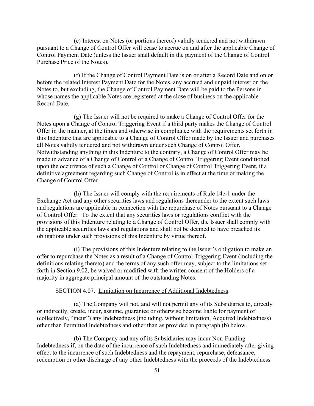 51(e)有效投标且未根据控制权变更要约撤回的票据(或其部分)的利息将在适用的控制权变更支付日及之后停止累积(除非发行人拖欠票据的控制权变更购买价款的支付)。(f)如控制权变更支付日为记录日期当日或之后,以及票据的相关利息支付日当日或之前,则票据至(但不包括)控制权变更支付日的任何应计及未付利息将于适用记录日期营业时间结束时支付予适用票据登记在其名下的人。(g)如第三方按照适用于发行人作出的控制权变更要约的方式、时间及其他符合本义齿中规定的要求作出控制权变更要约,并购买根据该控制权变更要约有效提交且未撤回的所有票据,则发行人将无需在控制权变更触发事件发生时就票据作出控制权变更要约。尽管本契约中有任何相反的规定,控制权变更要约可在控制权变更或控制权变更触发事件发生为条件的控制权变更或控制权变更触发事件发生之前作出,前提是关于此类控制权变更的最终协议在作出控制权变更要约时已生效。(h)发行人将遵守《交易法》第14e-1条规则的要求以及任何其他证券法律法规的要求,前提是这些法律法规适用于根据控制权变更要约回购票据。如任何证券法律或法规与本义齿有关控制权变更要约的规定相冲突,发行人应遵守适用的证券法律法规,不得因此被视为违反其在本义齿该等规定下的义务。(i)本指引有关发行人因控制权触发事件的变更而提出回购票据的要约的义务的条文(包括与之相关的定义)及任何该等要约的条款,可在第9.02条规定的限制下,经未偿还票据本金总额过半数的持有人书面同意后予以放弃或修改。第4.07节。对发生额外债务的限制。(a)公司不会、亦不会容许其任何附属公司直接或间接设立、招致、承担、担保或以其他方式承担(统称“招致”)除许可债务及下文(b)段规定以外的任何债务(包括但不限于已取得的债务)的偿付责任。(b)如公司及其任何附属公司在发生该等债务的日期及紧接令该等债务的发生生效及以该等债务的收益偿还、回购、撤销、赎回或以其他方式解除任何其他债务后,可能会产生无供资债务