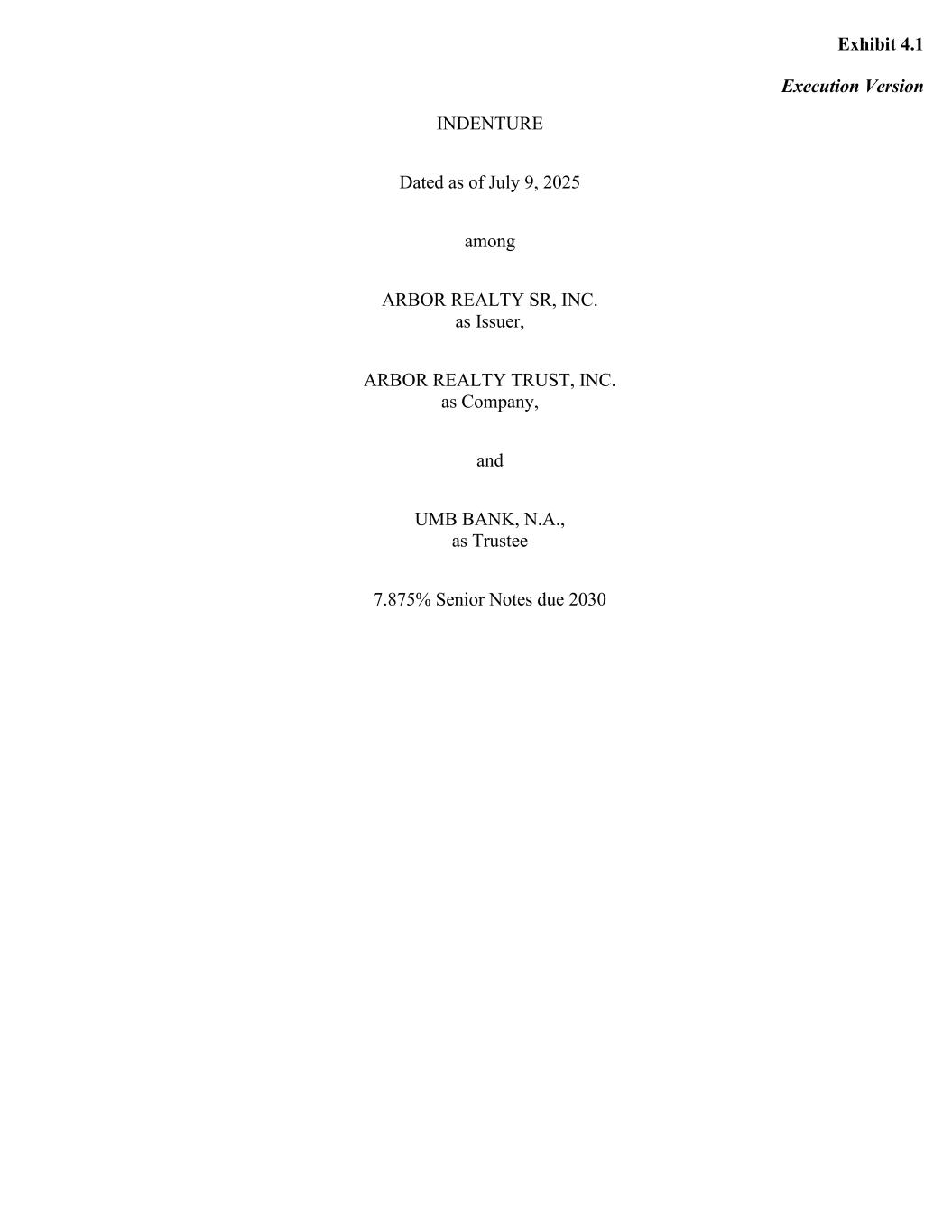 附件 4.1 ARBOR REALTY SR,INC.(作为发行人)、ARBOR REALTY TRUST,INC.(作为公司)和UMB BANK,N.A.(作为受托人)于2025年7月9日到期的7.875%优先票据的执行版契约