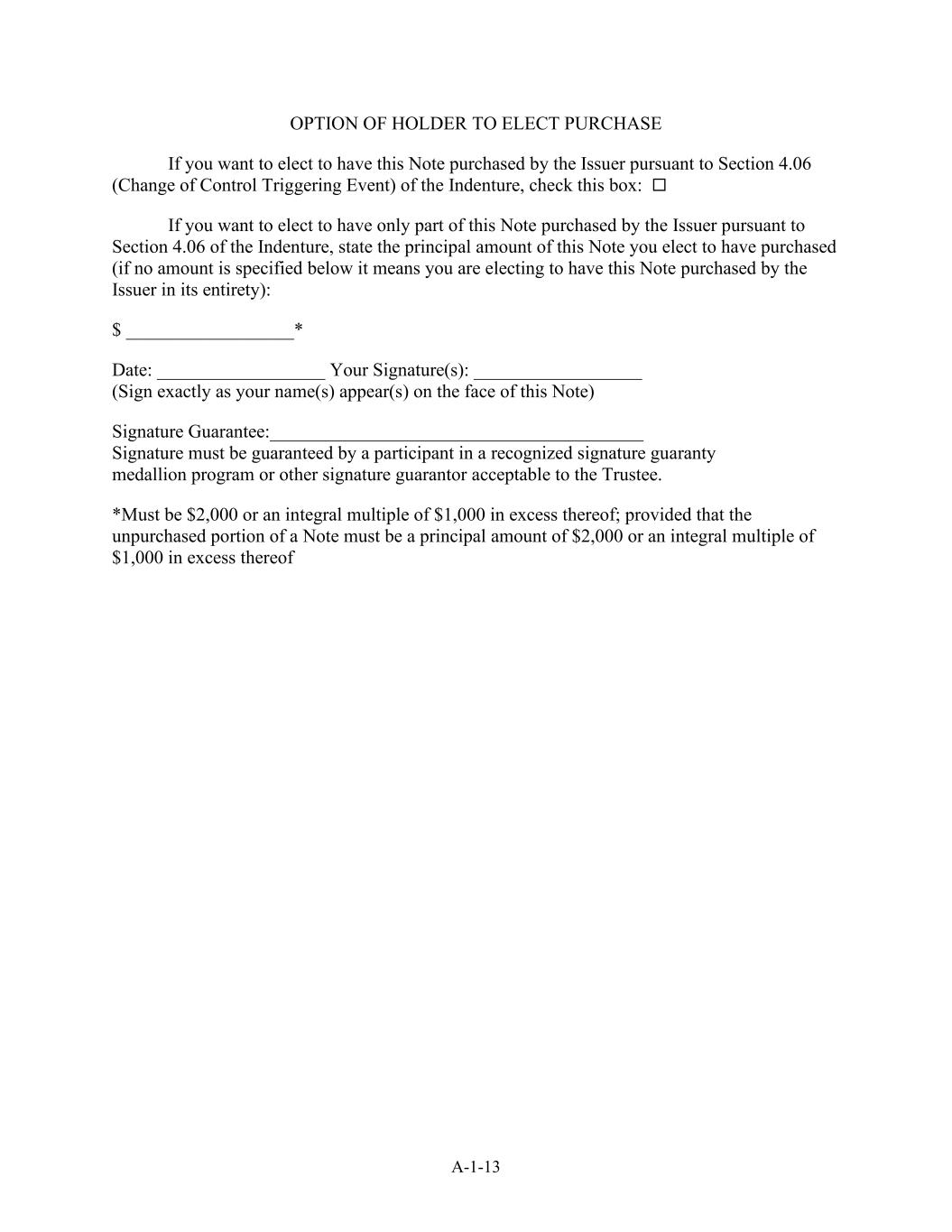 A-1-13持有人选择购买的选项如果您希望根据义齿第4.06节(控制权变更触发事件)选择由发行人购买本票据,请选中此框:如果您希望选择仅由发行人根据义齿第4.06节购买本票据的一部分,说明您选择购买的这张票据的本金金额(如果下面没有具体说明金额,则表示您选择由发行人全额购买这张票据):$ __________________*日期:__________________您的签名:__________________(完全按照您的名字出现在本说明的正面)签名保证:______________________________________________________签名必须由认可的签名保证奖章计划的参与者或受托人可以接受的其他签名保证人提供保证。*必须是2000美元或超过1000美元的整数倍;但票据未购买部分必须是本金2000美元或超过1000美元的整数倍