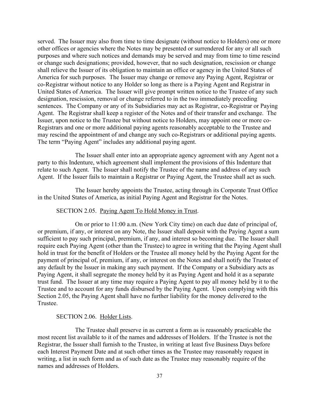 37人已服。发行人还可不时指定(不通知持有人)一个或多个其他办事处或机构,在这些办事处或机构中,可为任何或所有此类目的出示或交出票据,并可送达此类通知和要求,并可不时撤销或更改此类指定;但任何此类指定、撤销或变更均不得解除发行人为此类目的在美利坚合众国维持办事处或机构的义务。发行人可以在不通知任何持有人的情况下变更或解除任何付款代理人、注册官或共同注册官,只要在美利坚合众国有付款代理人和注册官。发行人将就紧接前两句所指的任何此类指定、撤销、撤销或变更及时向受托人发出书面通知。本公司或其任何附属公司可担任注册处处长、共同注册处处长或付款代理人。书记官长须备存有关票据及其转让及兑换的登记册。发行人在向受托人发出通知但无须通知持有人后,可委任一名或多于一名共同注册人及一名或多于一名受托人合理接受的额外付款代理人,并可撤销任何该等共同注册人或额外付款代理人的委任及更改。“支付代理”一词包括任何额外的支付代理。发行人应与非本契约一方的任何代理人订立适当的代理协议,该协议应执行本契约中与该代理人有关的规定。发行人应当将任何该等代理人的姓名、地址通知受托人。发行人未设立登记官或付款代理人的,由受托人代理。发行人特此指定受托人,通过其在美利坚合众国的公司信托办公室行事,作为票据的初始支付代理人和注册人。第2.05节。支付代理以信托方式持有资金。在任何票据的本金或溢价(如有)或利息的每个到期日上午11:00(纽约市时间)或之前,发行人应向付款代理存入一笔足以支付该等本金、溢价(如有)及如此到期的利息的款项。发行人应要求各付款代理人(受托人除外)书面同意,付款代理人应为持有人或受托人的利益以信托方式持有付款代理人为支付票据本金、溢价(如有)或利息而持有的所有款项,并应将发行人在支付任何该等款项时的任何违约情况通知受托人。公司或子公司作为支付代理的,应当将其作为支付代理持有的资金分离出来,作为单独的信托基金持有。发行人可以随时要求付款代理人将其持有的全部款项支付给受托人,并对付款代理人支付的任何资金进行会计处理。在遵守本条第2.05款后,付款代理人对交付给受托人的款项不再承担任何责任。第2.06节。持有人名单。受托人须以合理可行的当前格式保存其可获得的持有人姓名及地址的最新名单。如受托人并非注册官,则发行人须在每个利息支付日期前至少五个营业日,以及在受托人以书面合理要求的其他时间,以书面向受托人提供一份表格及截至受托人合理要求的日期的持有人姓名及地址清单。