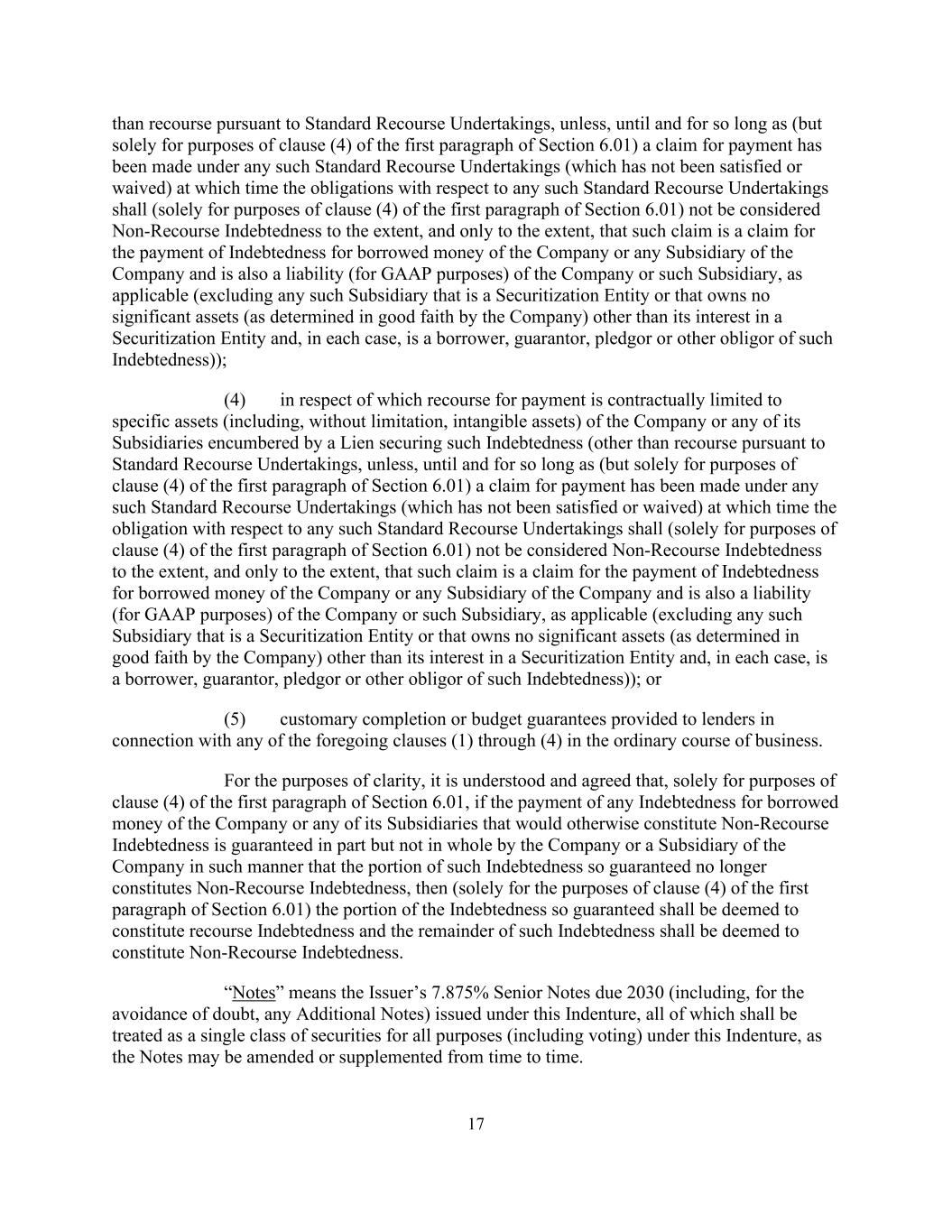 17而不是依据标准追索承诺追索,除非、直至及直至(但仅就第6.01条第1款第(4)款而言)已根据任何该等标准追索承诺提出付款申索(该等标准追索承诺未获履行或放弃),而此时与任何该等标准追索承诺有关的义务(仅就第6.01条第1款第(4)款而言)在以下范围内不被视为无追索权债务,且仅在以下范围内,此类索赔是为支付公司或公司任何子公司的借款债务而提出的索赔,也是公司或该子公司(如适用)的负债(就公认会计原则而言)(不包括作为证券化实体或除其在证券化实体中的权益外不拥有任何重要资产(由公司善意确定)的任何此类子公司,并且在每种情况下都是借款人、担保人,此类债务的出质人或其他债务人));(4)就其而言,付款的追索权根据合同限于公司或其任何子公司的特定资产(包括但不限于无形资产),这些资产由为此类债务提供担保的留置权作保(根据标准追索权承诺的追索权除外,除非,直至(但仅为第6.01条第1款第(4)款的目的)已根据任何该等标准追索承诺(该等标准追索承诺未获达成或放弃)提出付款申索,而在此期间,与任何该等标准追索承诺有关的义务(仅为第6.01条第1款第(4)款的目的)在以下范围内不得视为无追索权债务,且仅在以下范围内,此类索赔是为支付公司或公司任何子公司的借款债务而提出的索赔,也是公司或该子公司(如适用)的负债(就公认会计原则而言)(不包括任何此类子公司,该子公司是证券化实体或除其在证券化实体中的权益外不拥有任何重要资产(由公司善意确定),并且在每种情况下都是借款人、担保人,此类债务的出质人或其他债务人));或(5)在正常业务过程中就前述第(1)至第(4)条中的任何一条向贷款人提供的惯常完成或预算担保。为清楚起见,经理解及同意,仅就第6.01条第1款第(4)款而言,如公司或其任何附属公司的借款的任何债务的支付由公司或公司的附属公司以部分而非全部方式提供担保,以使如此担保的该部分债务不再构成无追索权债务,则(仅就第6.01条第1款第(4)款而言)如此担保的债务部分应被视为构成追索权债务,而该债务的其余部分应被视为构成无追索权债务。“票据”指发行人于2030年到期的7.875%优先票据(为免生疑问,包括任何额外票据)根据本契约发行,所有这些票据在本契约下的所有目的(包括投票)均应被视为单一类别的证券,因为票据可能会不时修订或补充。