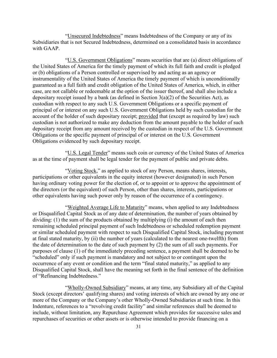 31“无担保债务”是指公司或其任何子公司的非有担保债务的债务,根据公认会计原则在综合基础上确定。“美国政府义务”是指以下证券:(a)美利坚合众国为及时付款而承担的、其完全信任和信用被质押的直接义务,或(b)由美利坚合众国控制或监督并作为其机构或工具行事的人的义务,其及时付款作为美利坚合众国的完全信任和信用义务得到无条件保证,在任何一种情况下,其发行人均不可选择赎回或赎回,还应包括银行发行的存托凭证(定义见《证券法》第3(a)(2)节),就任何此类美国政府债务或该托管人为该存托凭证持有人账户持有的任何此类美国政府债务的特定本金或利息支付担任托管人;但(除法律要求外)该托管人无权从该托管人就美国政府债务或该存托凭证所证明的美国政府债务的特定本金或利息支付而收到的任何金额中扣除应付给该存托凭证持有人的金额。“美国法定货币”是指付款时的美利坚合众国硬币或货币,为支付公私债务的法定货币。适用于任何人的股票的“有表决权股份”是指在该人拥有选举、委任或批准委任该人的董事(或同等人员)的普通投票权的股份、权益、参与或股权中的其他等价物(无论其如何指定),但仅因或有事项发生而具有该等权力的股份、权益、参与或其他等价物除外。“到期加权平均年限”是指,当适用于截至任何确定日期的任何债务或不合格股本时,通过除以:(1)乘以(i)该债务的每笔当时剩余的预定本金支付或预定赎回支付或与该不合格股本相关的类似预定支付的金额而获得的产品的总和,包括在最终规定的到期日支付,按(ii)从确定日期至该等付款日期的年数(以最接近的十二分之一计算)按(2)所有该等付款的总和计算。就上一句第(1)款而言,只有当付款是强制性的,并且不受任何事件或条件的发生或取决于发生,并且适用于任何不合格股本的术语“最终声明的到期日”应具有“再融资债务”定义的最后一句中规定的含义时,才应将付款视为“预定的”。「全资附属公司」指任何附属公司在任何时间,其全部股本(董事合资格股份除外)及表决权权益由公司或公司其他全资附属公司的任何一间或多于一间于该时间拥有。在本契约中,提及“循环信贷融资”和类似的提法应被视为包括但不限于规定连续出售和回购证券或其他资产或以其他方式旨在提供融资的任何回购协议
