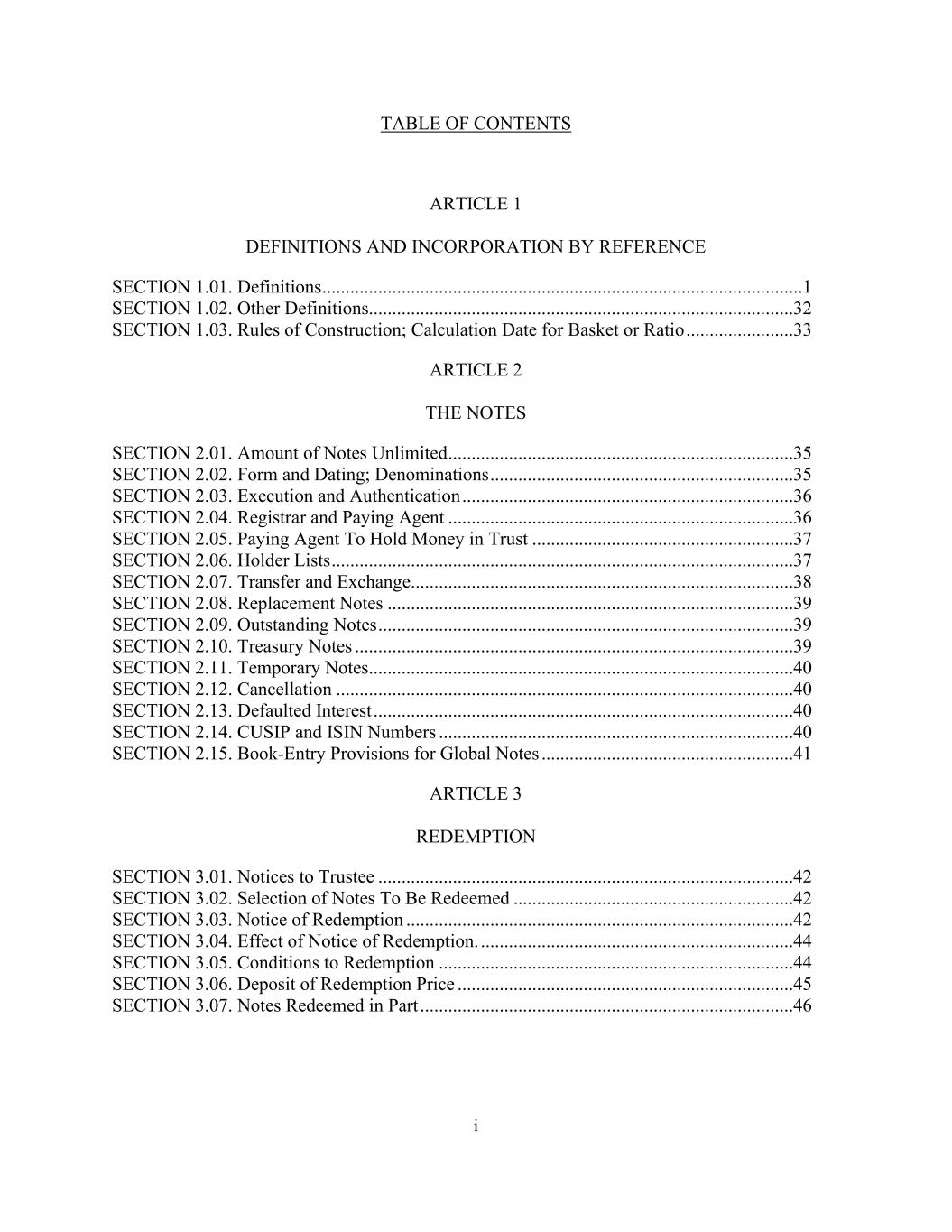 i目录第1条定义和纳入参照第1.01节。定义................................................................................................1第1.02节。其他定义...................................................................................................32第1.03节。建造规则;篮子或比率的计算日期.......................33第二条注2.01款。票据金额无限.................................................................................... 35第2.02条。形式和日期;面额...................................................................35第2.03条。执行和认证.......................................................................36第2.04节。注册处处长及付款代理人.................................................................................... 36第2.05条。付款代理人以信托方式持有款项........................................................ 37第2.06条。持有人名单...................................................................................................37第2.07节。转让与交换.................................................................................... 38第2.08条。替换说明....................................................................................39第2.09条。未付票据....................................................................................39第2.10节。国库券......................................................................................39第2.11条。临时说明...................................................................................40第2.12节。取消..................................................................................................40第2.13节。违约利息.......................................................................................40第2.14节。CUSIP和ISIN号码.......................................................................................40第2.15节。全球票据的记账条款......................................................41第3条赎回第3.01款。向受托人发出的通知.....................................................................................42第3.02条。选择要赎回的票据....................................................................42第3.03条。赎回通知...................................................................................42第3.04条。赎回通知的效力。...................................................................44第3.05节。赎回的条件...................................................................................44第3.06条。赎回价款的交存...................................................................................45第3.07条。部分赎回的票据.......................................................................................46
