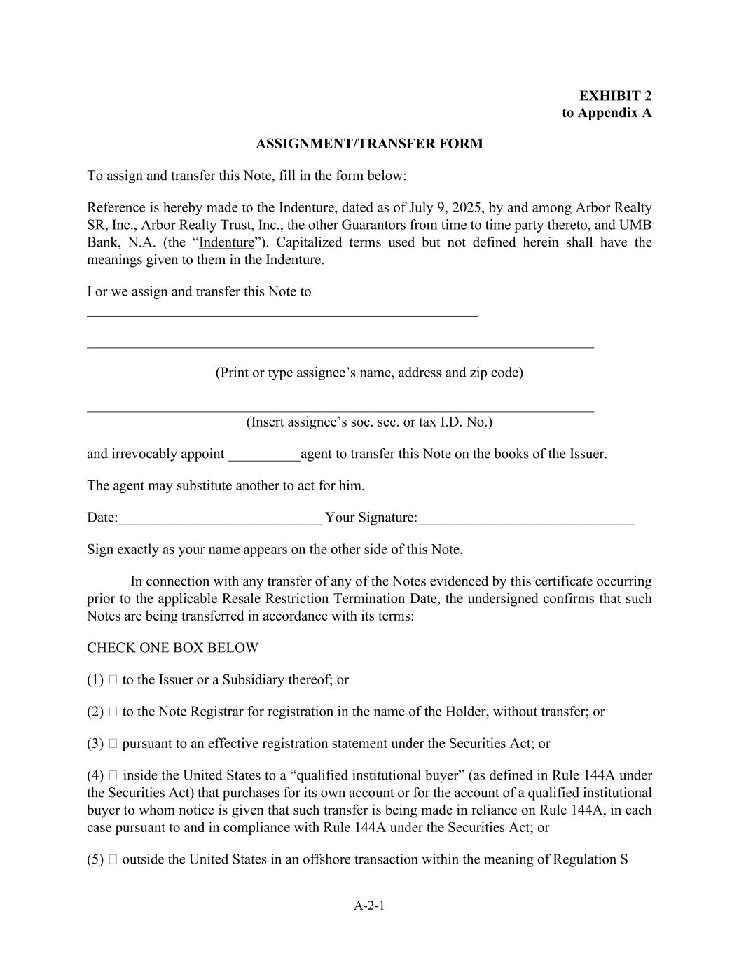 A-2-1附件2附录一份转让/转让表格以转让和转让本附注,请填写表格如下:兹提述Arbor Realty SR,Inc.、Arbor Realty Trust, Inc.、其他不时作为其当事人的担保人以及UMB Bank,N.A.(“契约”)于2025年7月9日签署的契约。此处使用但未定义的大写术语应具有义齿中赋予它们的含义。本人或我们将本说明转让给______________________________________________________________________________________________________________________________________________________________________________(打印或键入受让人的姓名、地址和邮编)____________________________________________________________________________________________________________________________________________________________________________________________________________________________________________________________________________________________________________________________________________________________________________________________________________________________________________________________________________________________________________________________代理人可以代替另一人代他行事。日期:______________________________您的签名:______________________________与您的名字出现在这张纸条的另一面完全一致的签名。就在适用的转售限制终止日期之前发生的本证书所证明的任何票据的任何转让而言,以下签署人确认该等票据是根据其条款转让的:勾选以下一个方框(1)予发行人或其附属公司;或(2)予票据登记处处长以持有人的名义登记,不转让;或(3)根据《证券法》下的有效登记声明;或(4)在美国境内向“合格机构买方”(定义见《证券法》第144A条)购买,该“合格机构买方”为其自己的账户或向其发出通知的合格机构买方的账户进行此类转让,在每种情况下均根据并遵守《证券法》第144A条;或(5)在美国境外进行第S条所指的离岸交易