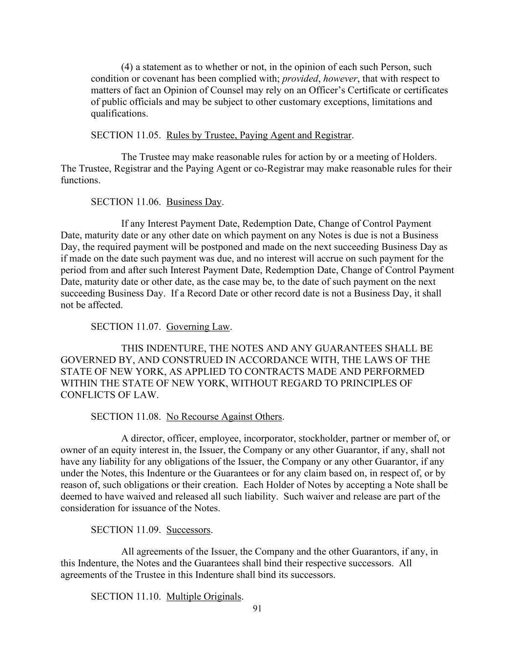 91(4)关于每名该等人认为该等条件或契诺是否已获遵从的陈述;但条件是,就事实上的事宜而言,大律师的意见可依赖人员的证明书或公职人员的证明书,并可受其他习惯例外、限制及资格的规限。第11.05节。受托人、付款代理人及注册官的规则。受托人可以为持有人或持有人会议的行动制定合理的规则。受托人、注册官及付款代理人或共同注册官可就其职能订立合理规则。第11.06节。营业日。倘任何付息日、赎回日、控制权变更支付日、到期日或任何票据到期付款的任何其他日期并非营业日,则所规定的付款将被推迟,并在下一个营业日作出,犹如在该等付款到期之日作出一样,而自该付息日、赎回日、控制权变更支付日、到期日或其他日期(视情况而定)起及之后的期间,该等付款将不会产生利息,至下一个营业日支付该款项之日止。记录日期或其他记录日期不是营业日的,不受影响。第11.07节。管辖法律。本契约、票据和任何担保应由适用于在纽约州境内订立和履行的合同的纽约州法律管辖并按照其建造,不涉及法律冲突原则。第11.08节。不得对他人采取追索措施。发行人、公司或任何其他担保人(如有的话)的董事、高级职员、雇员、入主人、股东、合伙人或成员,或股权所有人,均不对发行人、公司或任何其他担保人(如有的话)在票据、本义齿或担保项下的任何义务承担任何责任,或对基于、关于或由于此类义务或其创设而产生的任何索赔承担任何责任。票据的每一持有人通过接受一张票据,应被视为已放弃并解除所有该等赔偿责任。该等豁免及豁免是发行票据的部分考虑。第11.09节。继任者。发行人、公司及其他担保人(如有的话)在本契约中的所有协议、票据及担保均对其各自的继承人具有约束力。受托人在本契约中的所有协议均对其继承人具有约束力。第11.10节。多个原件。